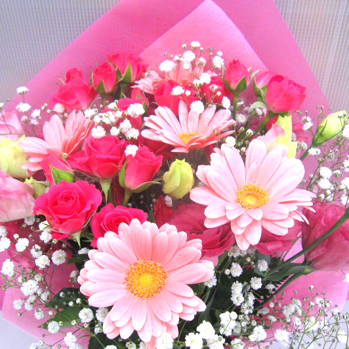 ピンク系のグラデーションが綺麗な華やかな花束です。女性へ差し上げるプレゼントにオススメです。【15時迄のご注文で翌日届きます】※こちらの商品についてのご相談、ご質問等ございましたら(メール)または(お電話)にて承ります。