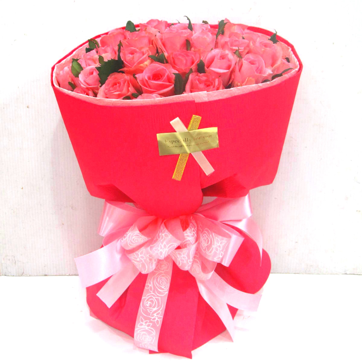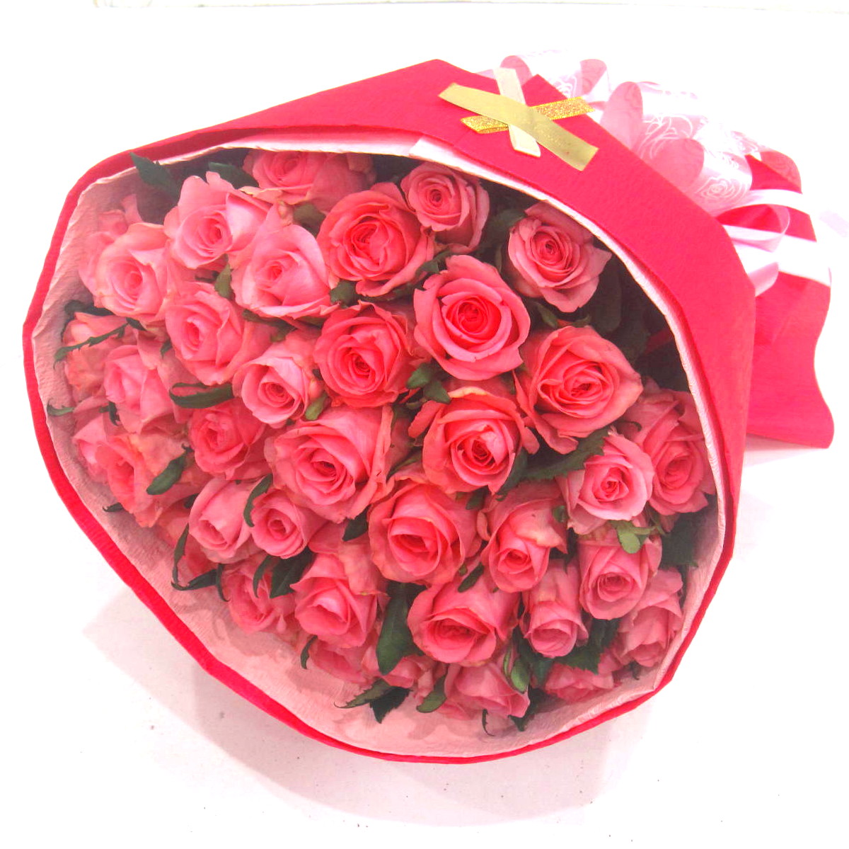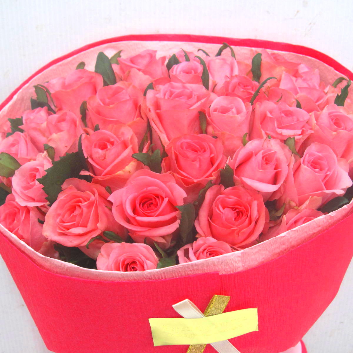 ピンクバラ40本の花束です。短めの可愛らしい雰囲気ですがズシッと重たく重量感があり、ボリューム感があります。特別な日の為に、市場から厳選したピンクバラを使用し、ラッピングも上品にお包みします。花持ちも良く、ご購入されたお客様から高い評価を頂いております。当店ではお客様の想いを大切に【こころを込めて】お作りいたします。静岡県長泉町から手渡しお届けまたは宅急便で全国にお届けします。是非、さまざまな贈り物に。