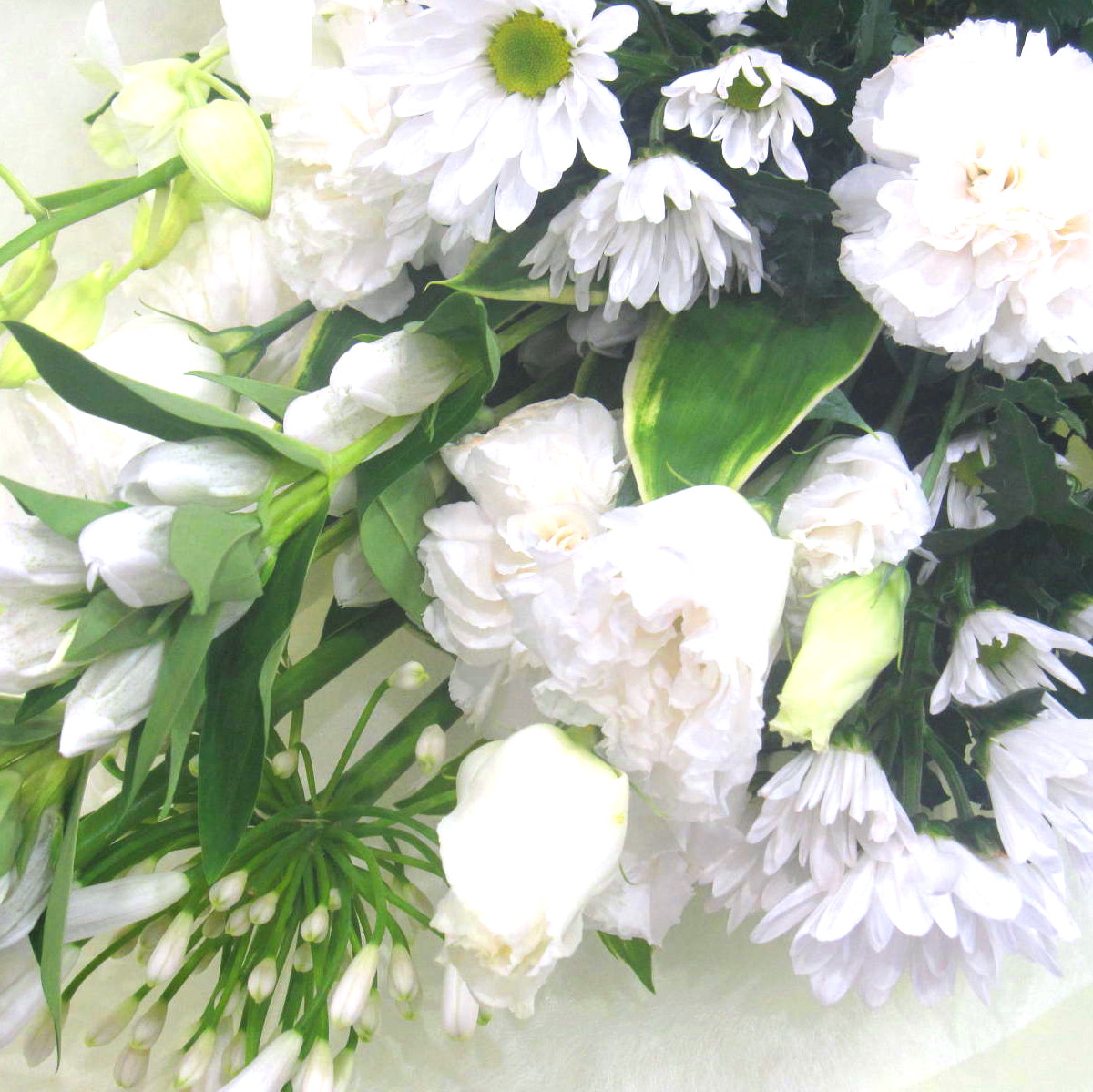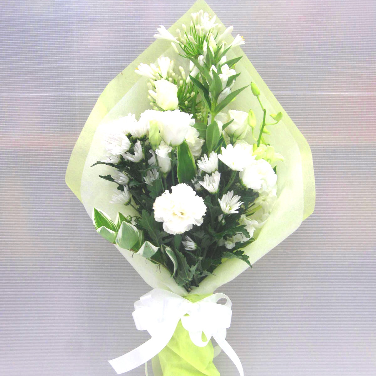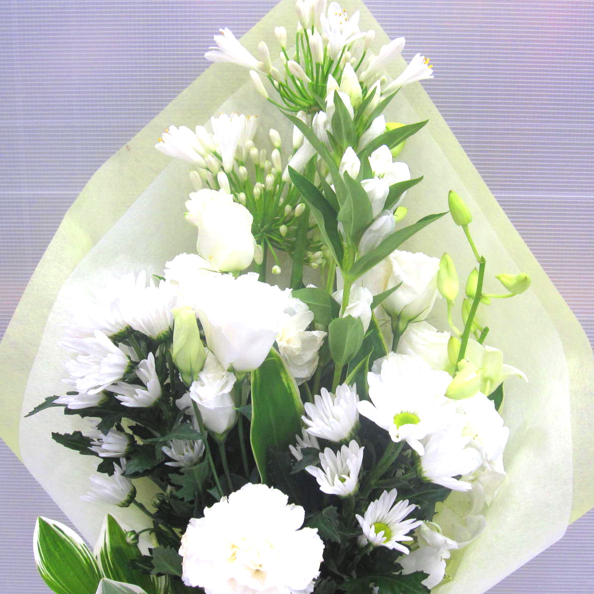 洋花と和花をミックスした白&グリーン系の控えめな花束です。清楚で上品な雰囲気だった故人を弔い癒してくれるでしょう。花持ちの良い花材を中心にまとめて上品にお作り致します。当店では、お客様のその想いをしっかりと受け止め、心を込めて制作致します。静岡県から全国へお届けします。故人を偲ぶ色々なシーンで是非、ご利用下さい。