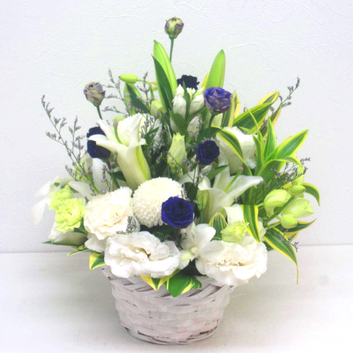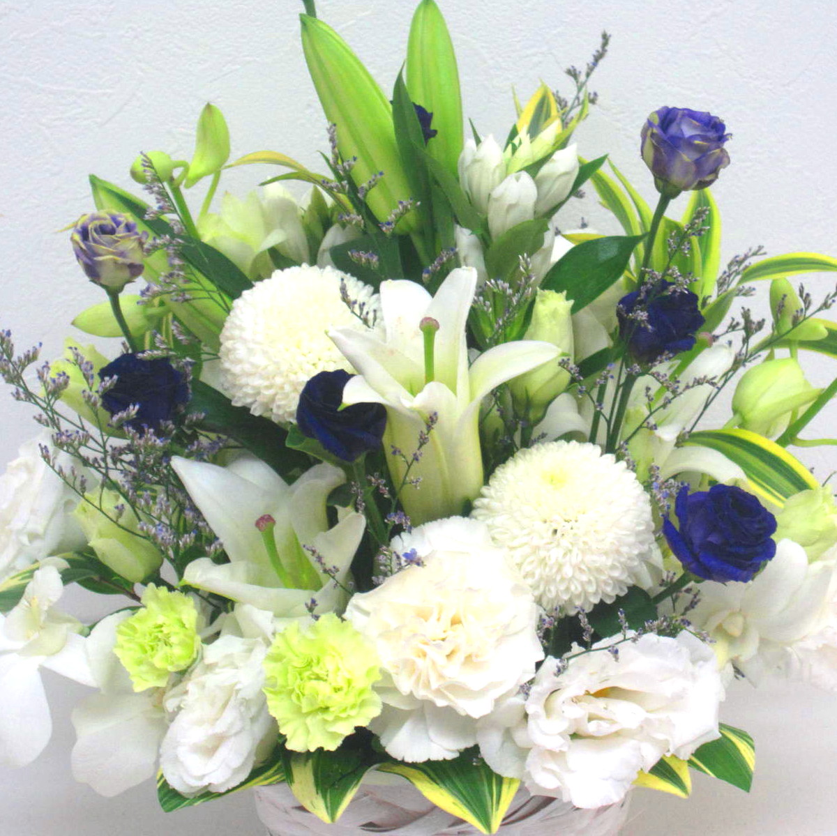 白系主体のアクセントに紫系のお花を入れたナチュラルで涼しげな雰囲気が漂うお供え用アレンジメント。お供え、ご命日、法要やお盆・新盆、お彼岸にオススメです。【15時迄のご注文で翌日届きます】※こちらの商品についてのご相談、ご質問等ございましたら(メール)または(お電話)にて承ります。