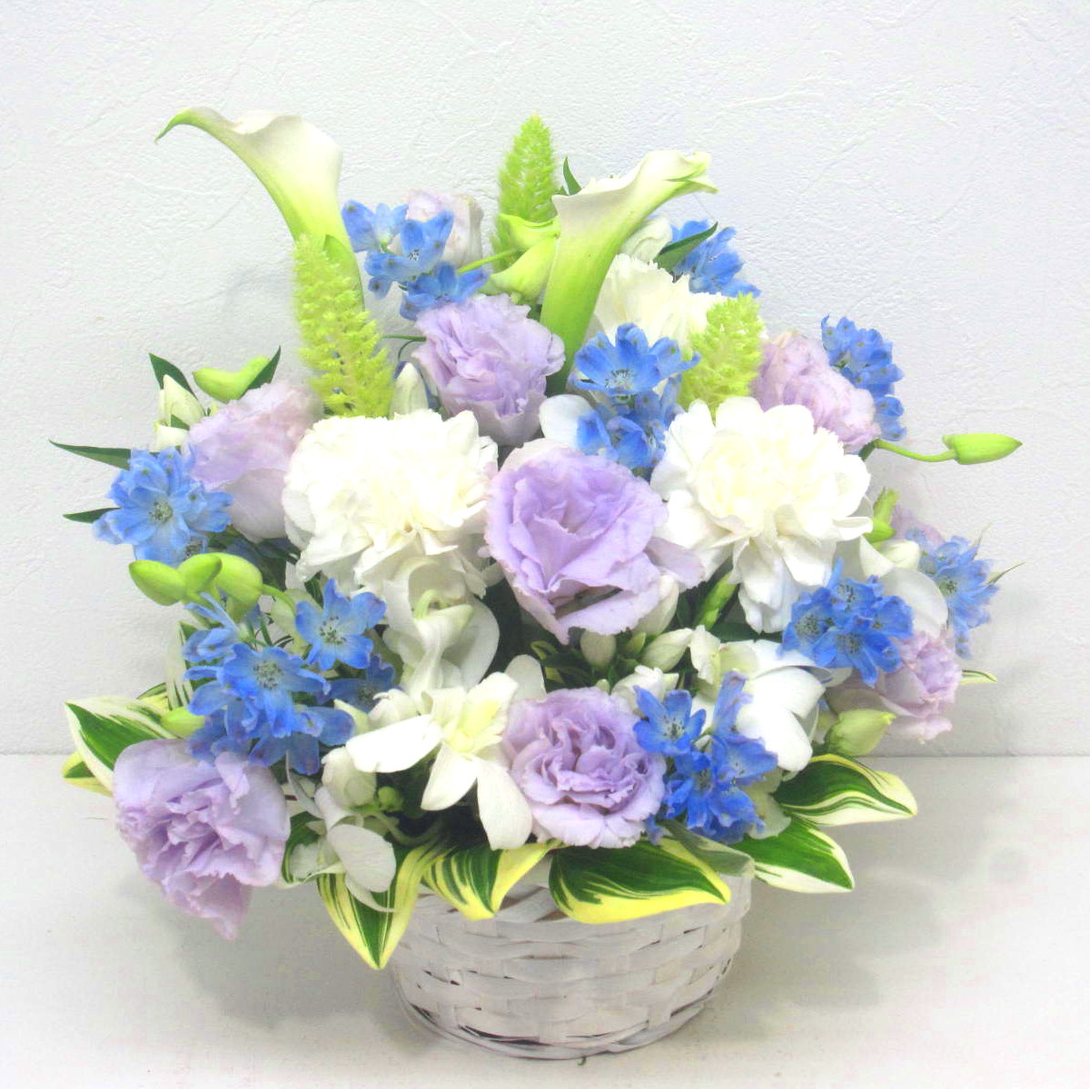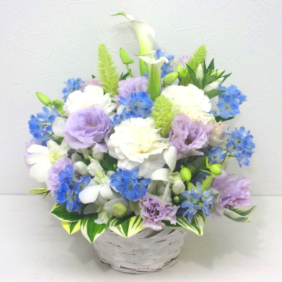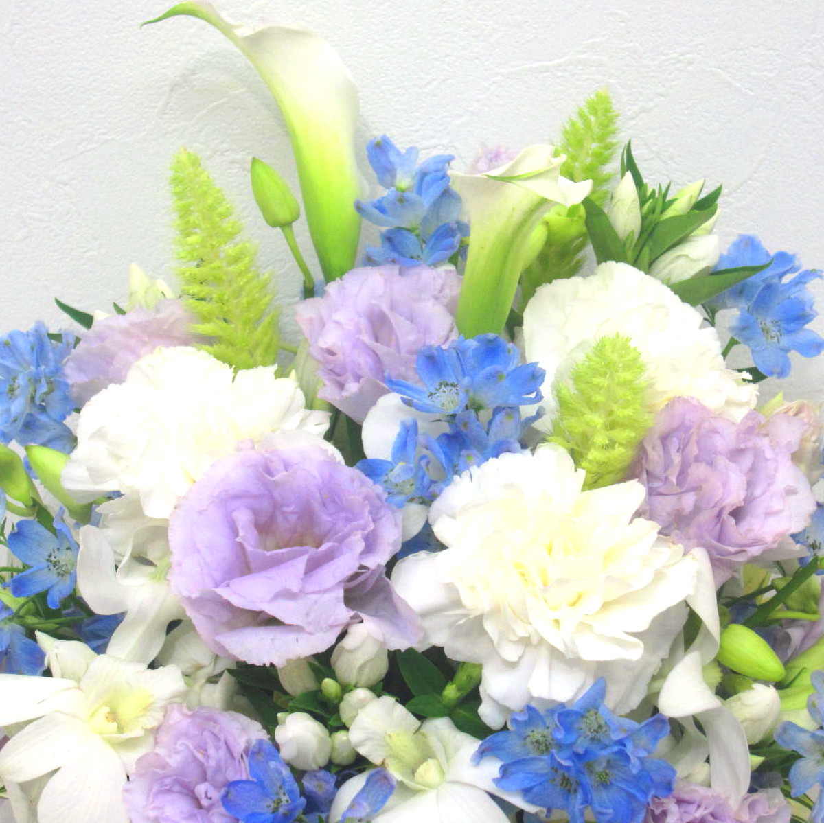 白系主体で淡い紫色がソフトに優しく故人を弔い癒してくれるでしょう。花持ちの良い花材を中心にまとめて上品にお作り致します。当店では、お客様のその想いをしっかりと受け止め、心を込めて制作致します。静岡県から全国へお届けします。故人を偲ぶ色々なシーンで是非、ご利用下さい。