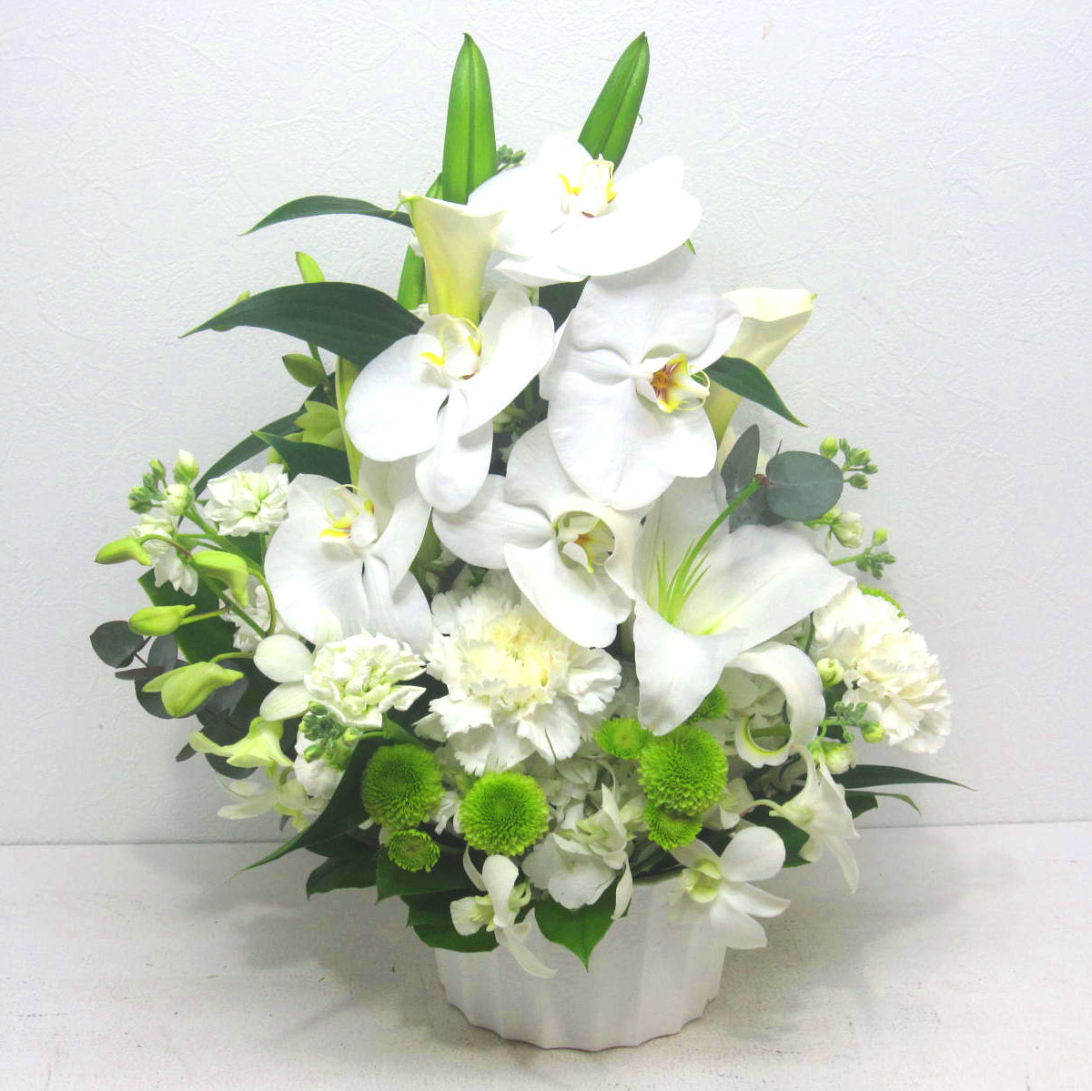 花材: メイン ユリ、マム、カーネーション、胡蝶蘭など その他 葉物類など