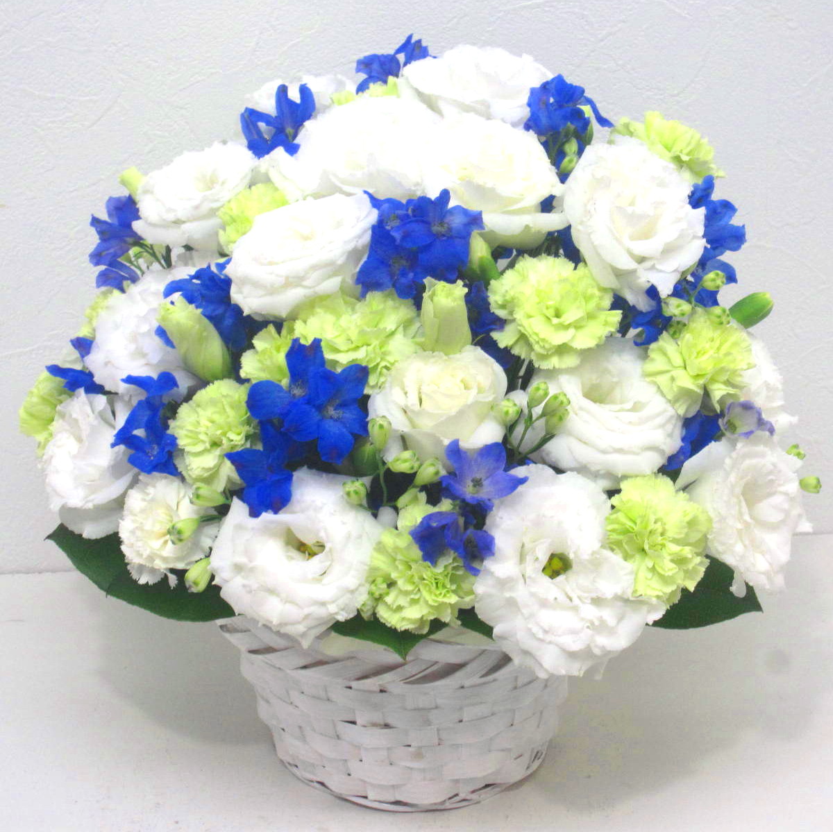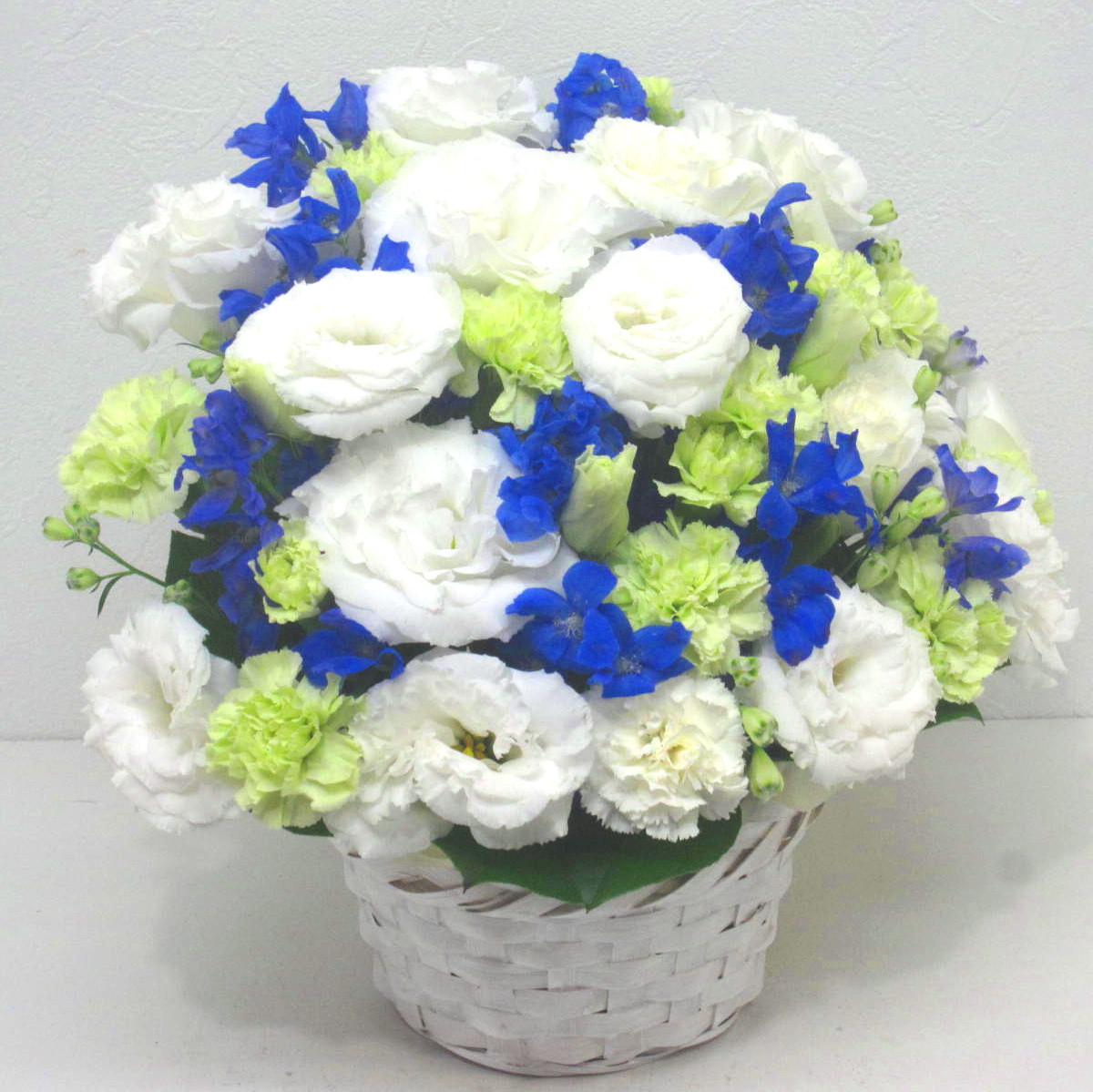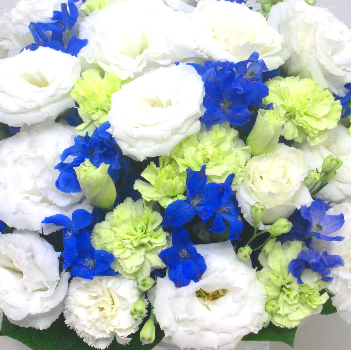 白系主体にブルーのお花の入った涼しげなお供え用アレンジメント。控えめの色合いで上品にお作りします。【15時迄のご注文で翌日届きます】※こちらの商品についてのご相談、ご質問等ございましたら(メール)または(お電話)にて承ります。