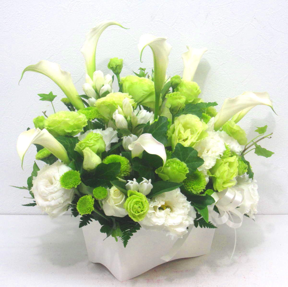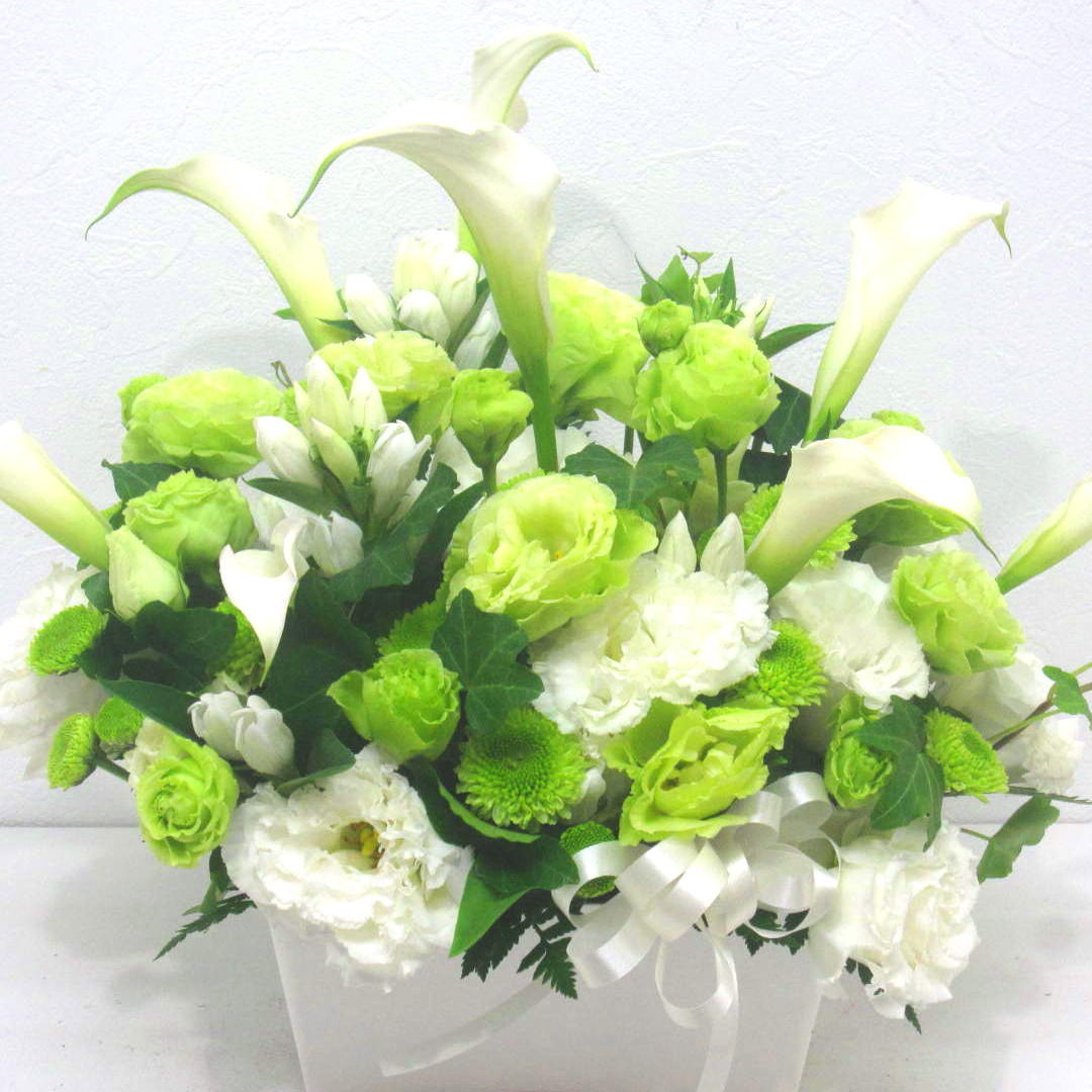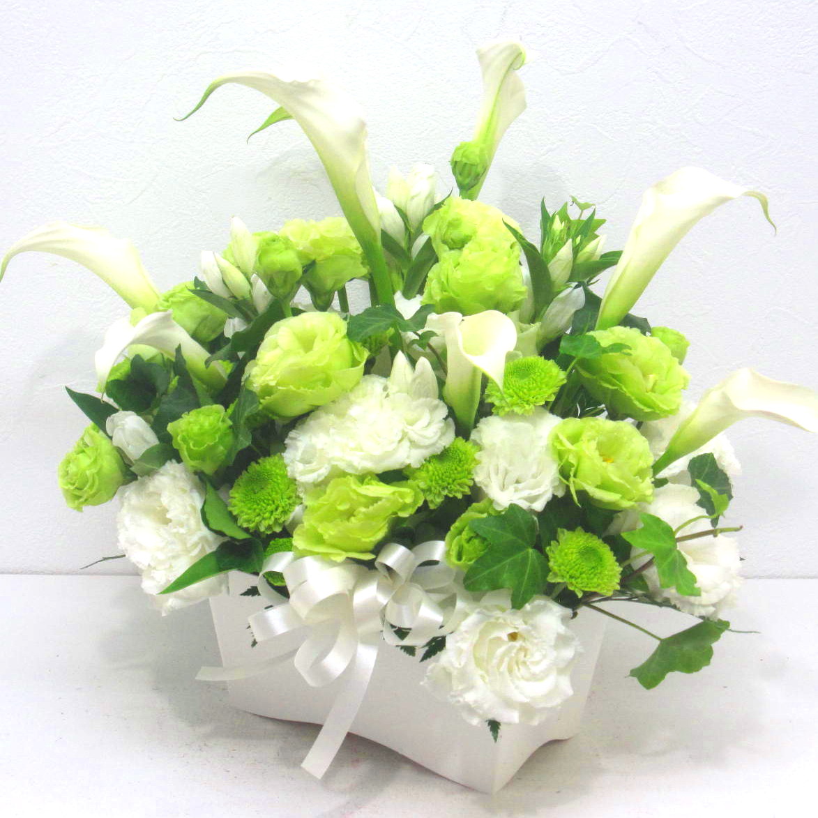 白いお花《カラー》を中心としたお供えアレンジメント。白&グリーンの清楚で上品な色合いが静かに心を癒します。【15時迄のご注文で翌日届きます】※こちらの商品についてのご相談、ご質問等ございましたら(メール)または(お電話)にて承ります。