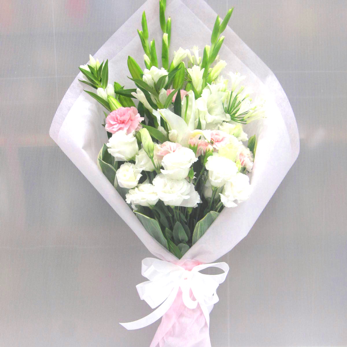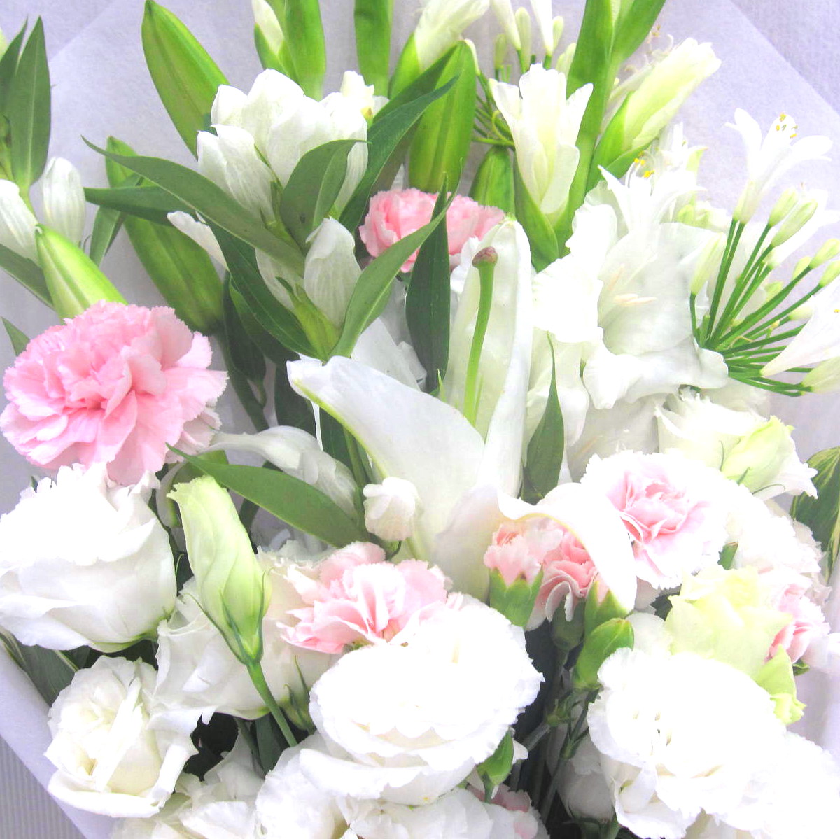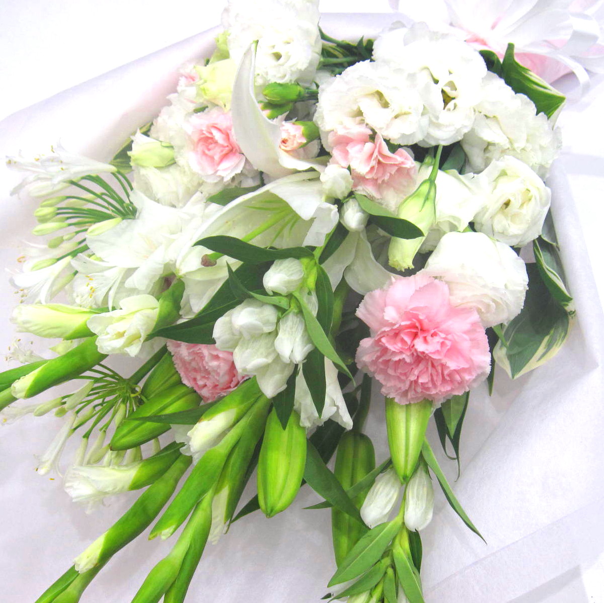 洋花のみを使用した上品で優しい雰囲気のお供え用花束。上品で優しい雰囲気だった故人を弔い、心を癒します。【15時迄のご注文で翌日届きます】※こちらの商品についてのご相談、ご質問等ございましたら(メール)または(お電話)にて承ります。
