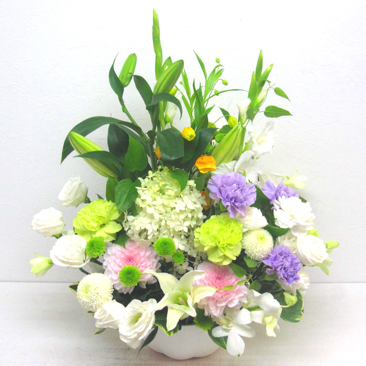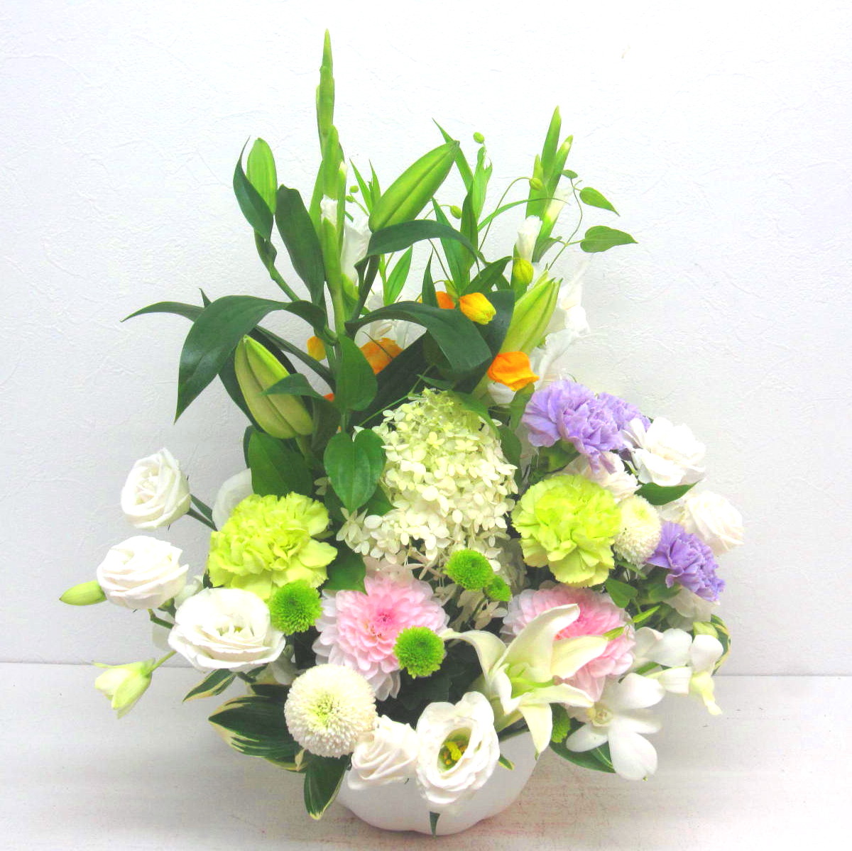 花材: メイン ユリ、カーネーション、マム、トルコギキョウ、デンファレなど その他 季節のお花、葉物類など