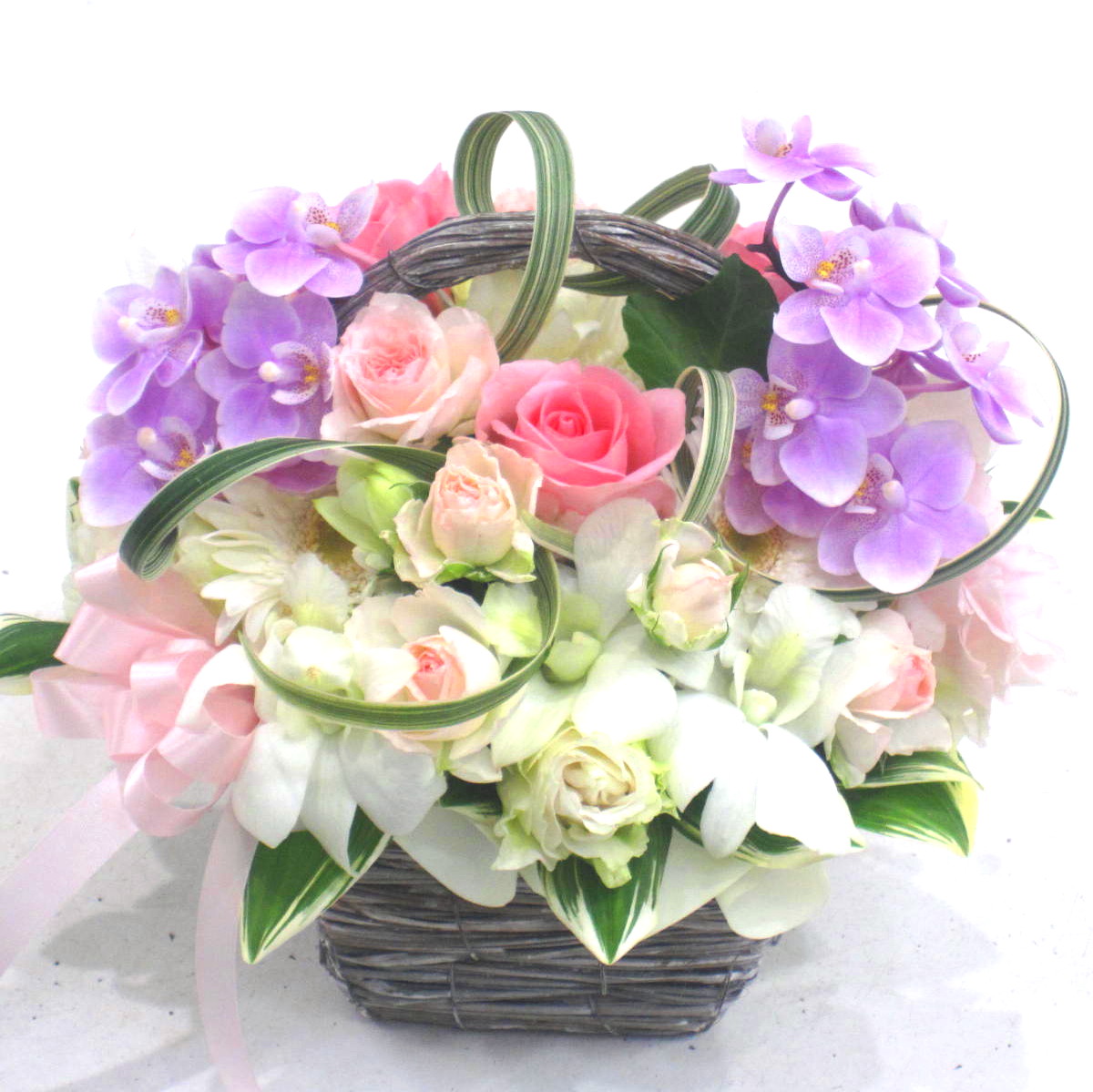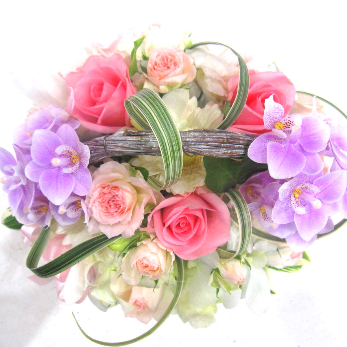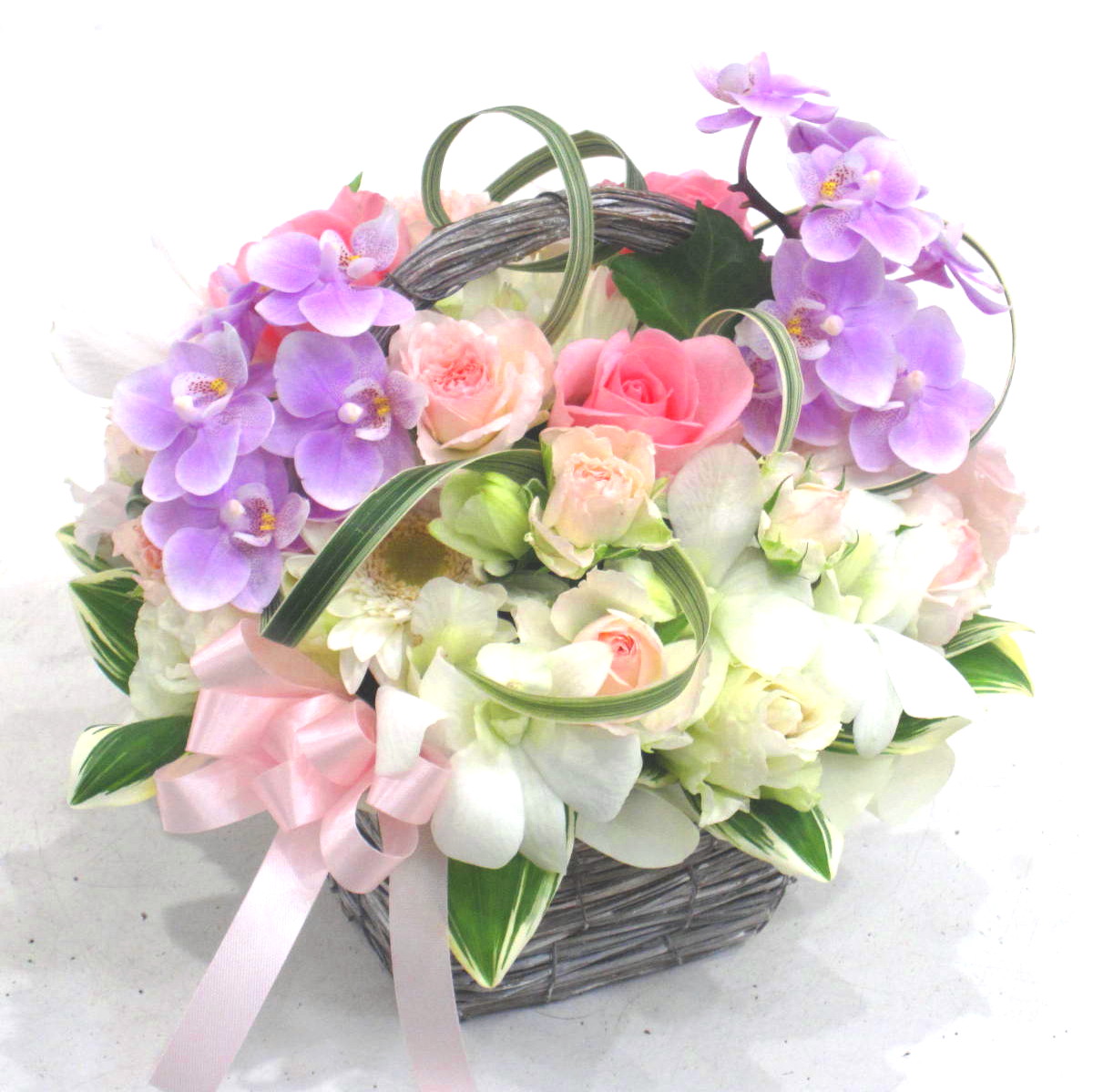 淡い可愛らしい色彩でお作りした優しい雰囲気のアレンジメント。バラやガーベラ、トルコギキョウ、蘭系のお花など人気の高いお花でまとめた人気の高い贈り物です【15時迄のご注文で翌日届きます】※こちらの商品についてのご相談、ご質問等ございましたら(メール)または(お電話)にて承ります。