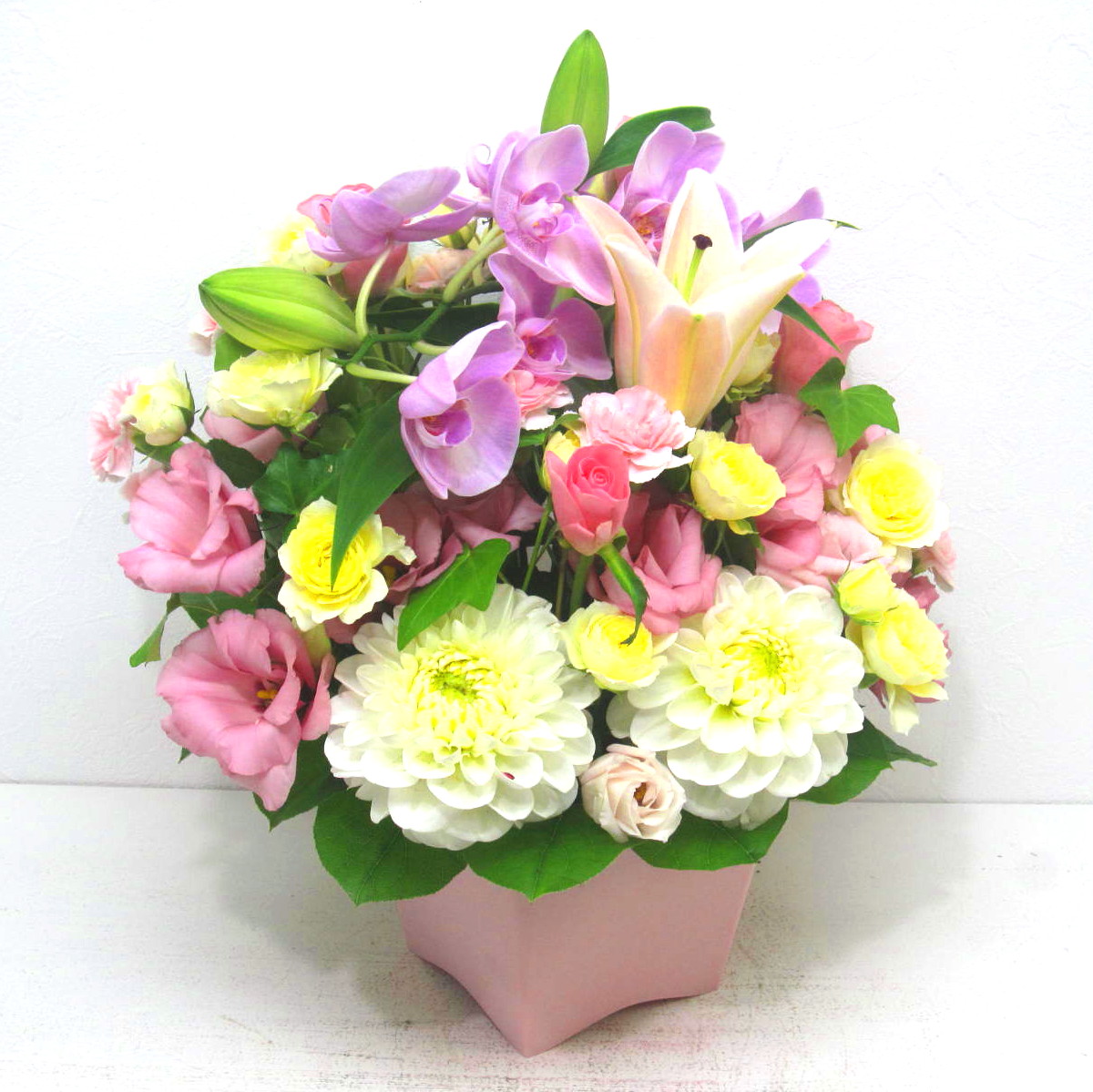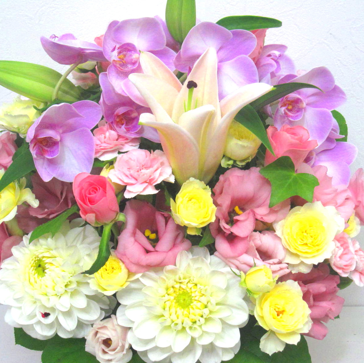 花材: メイン ユリ、バラ、ダリア、トルコギキョウ、コチョウランなど その他 葉物類など