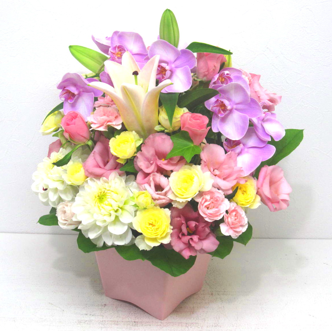 「ユリ」や「コチョウラン」など上質なお花を主体に制作したアレンジメント。優しく包み込む色合いが誰からも愛されます。※こちらの商品についてのご相談、ご質問等ございましたら(メール)または(お電話)にて承ります