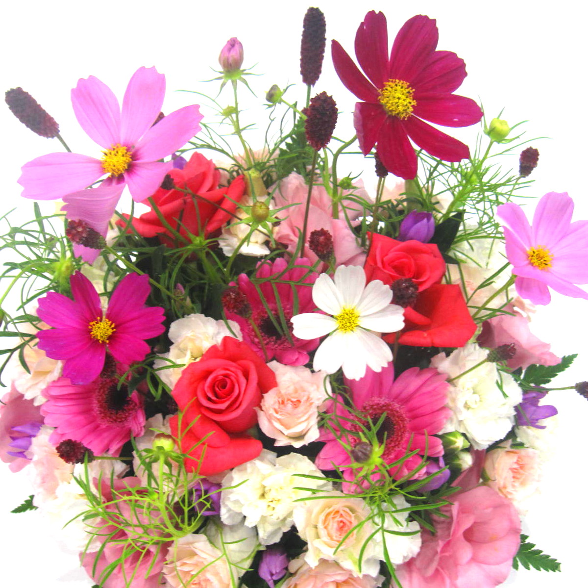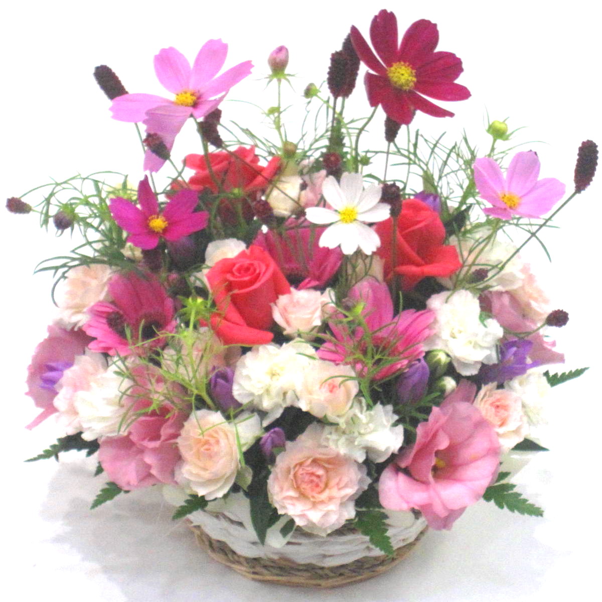 花材: メイン コスモス、リンドウ、ワレモコウ、バラ、ガーベラ、トルコギキョウなど その他 葉物類など