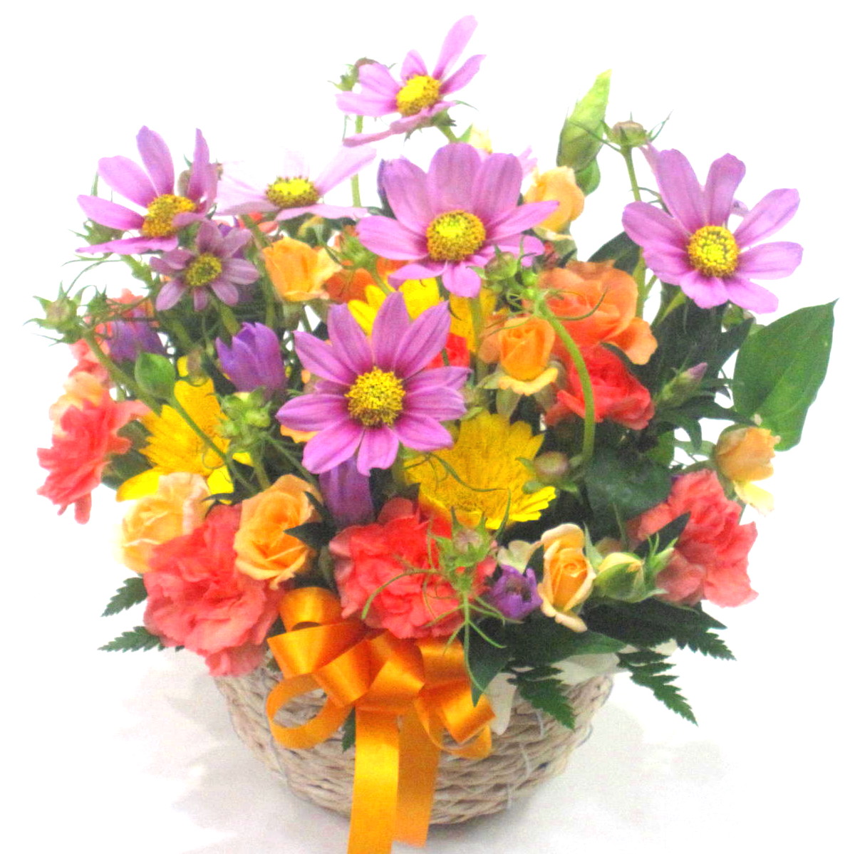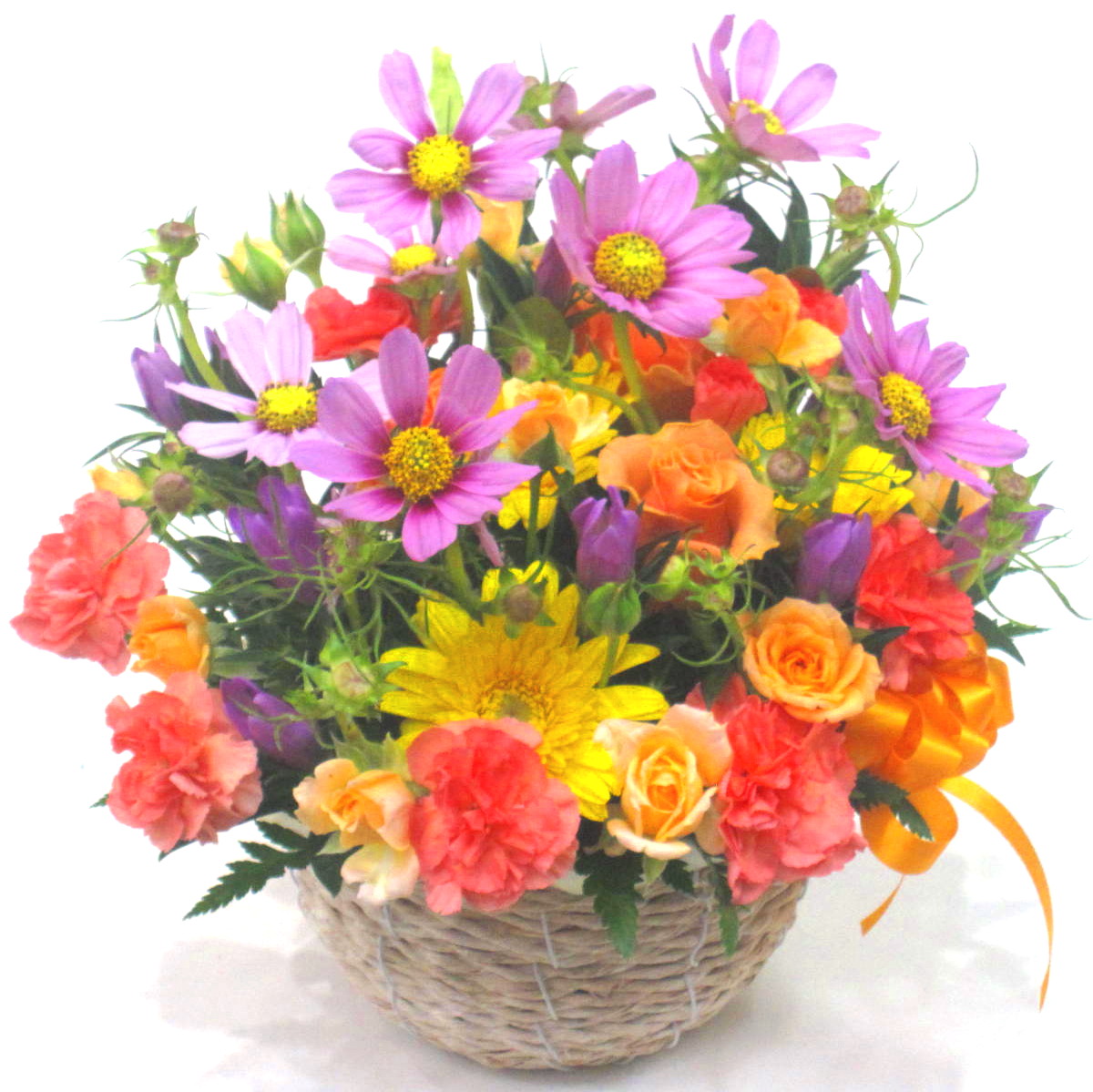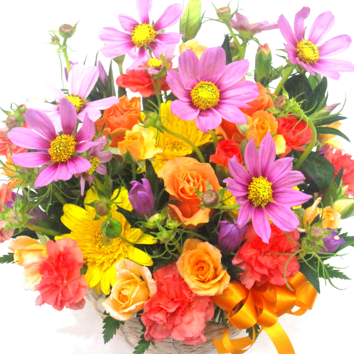 とっても明るい秋のアレンジメント。黄色&オレンジ系の色合いがコスモスとマッチして生き生きと花々が咲き誇ります。【15時迄のご注文で翌日届きます】※こちらの商品についてのご相談、ご質問等ございましたら(メール)または(お電話)にて承ります。