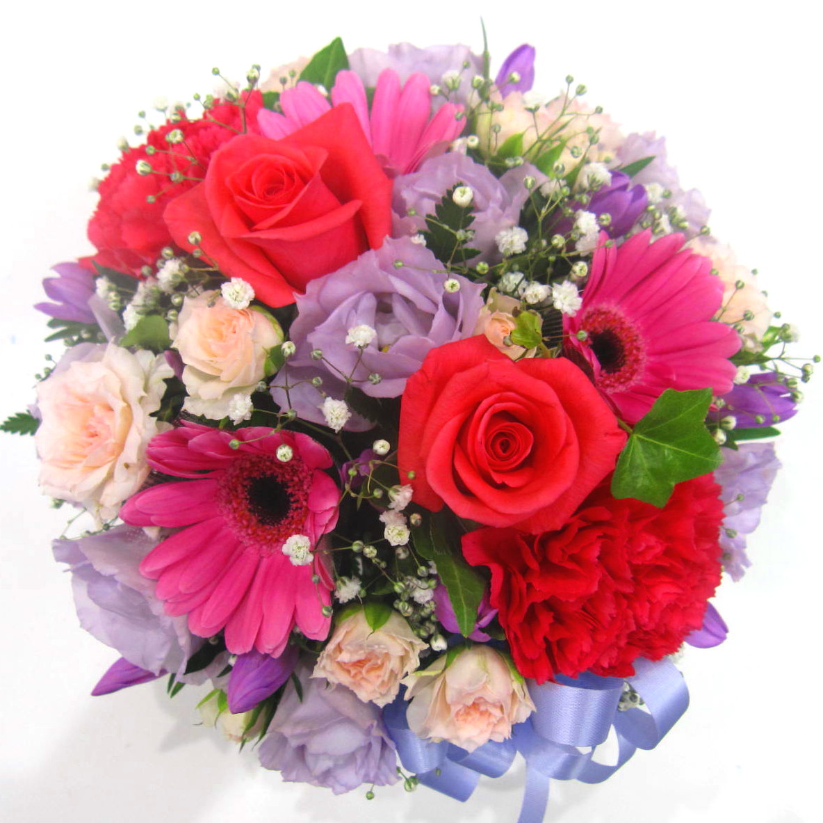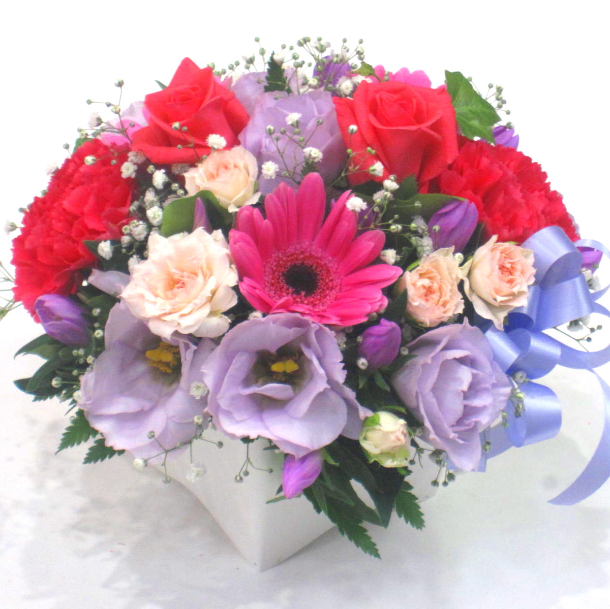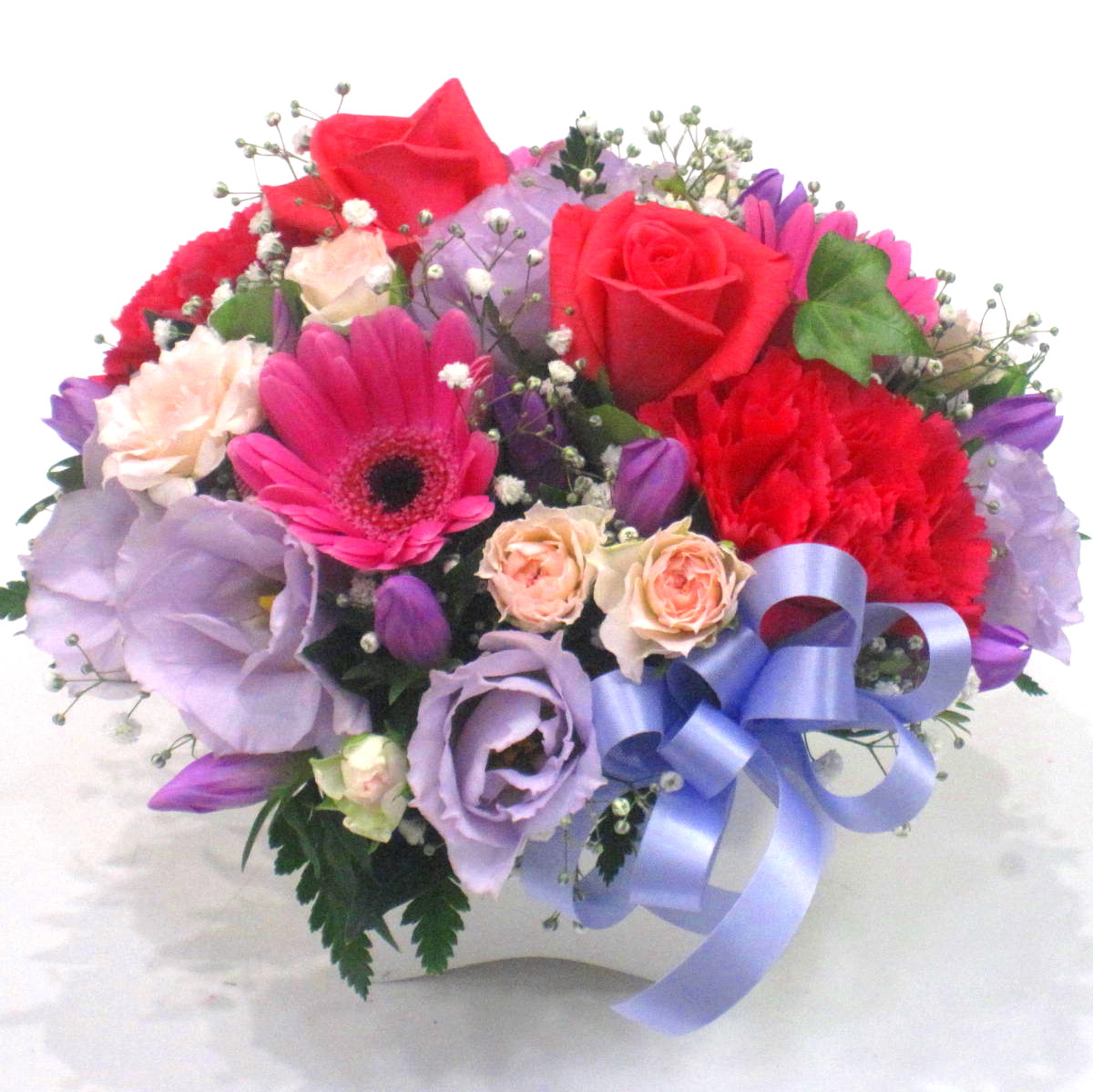 花材: メイン リンドウ、バラ、ガーベラ、カーネーション、トルコギキョウなど その他 かすみ草、葉物類など