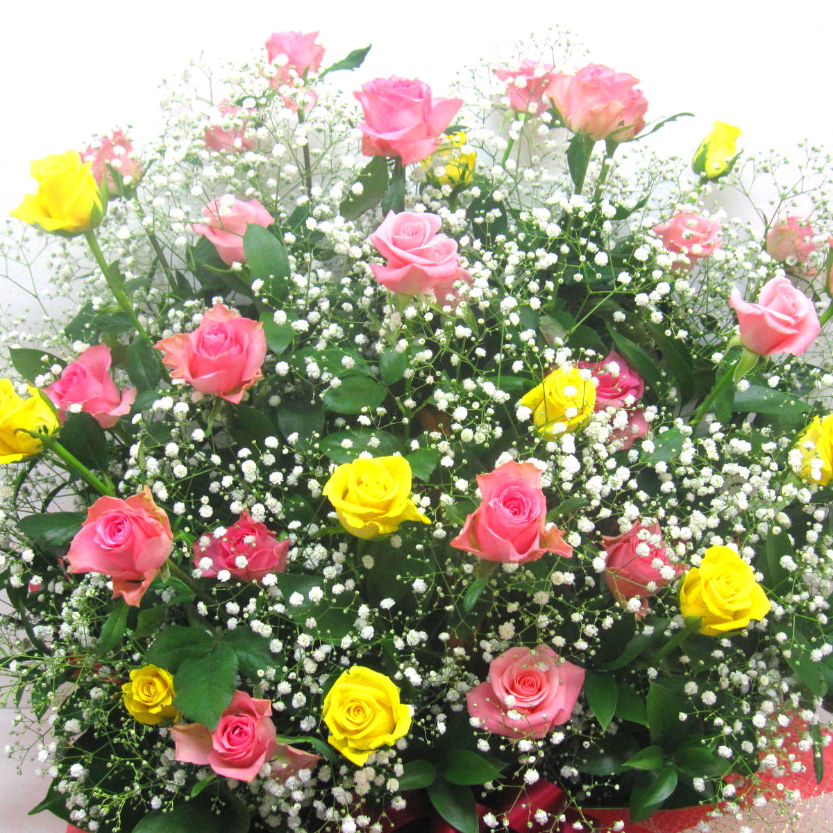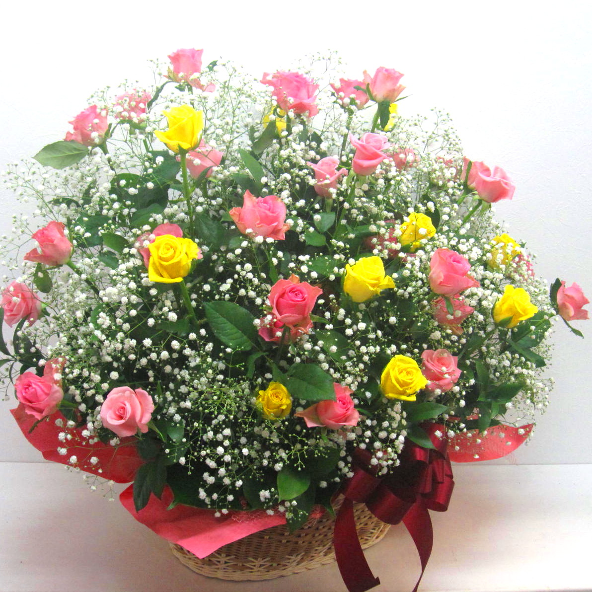その日、市場から入荷した鮮度の良い薔薇をカラフルにまとめて、カスミソウでボリューム感を演出した特大アレンジメントです。届いた瞬間、薔薇の甘い香りが「フワ~」っとしてきっと酔いしれちゃいますよ。また、ご利用されたお客様から「大変花持ちが良い」と好評をいただいております。静岡県長泉町から日本全国【真心】込めてお届けいたします。さまざまなご用途に贈る贈り物としてオススメです。大切な方へ贈るフラワーギフトやプレゼントなら「花樹園オンラインドットコム」に是非、お任せ下さいませ。
