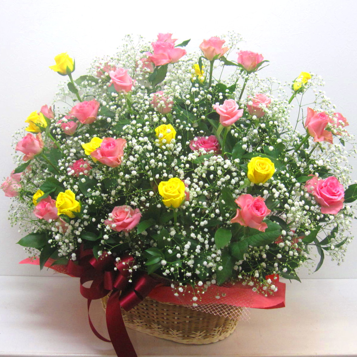 《希望本数・色指定可能》大きなバスケットに色とりどりの薔薇をカラフルに入れたアレンジメント。迫力があり特別な贈り物にオススメですよ。【15時迄のご注文で翌日届きます】※こちらの商品についてのご相談、ご質問等ございましたら(メール)または(お電話)にて承ります。
