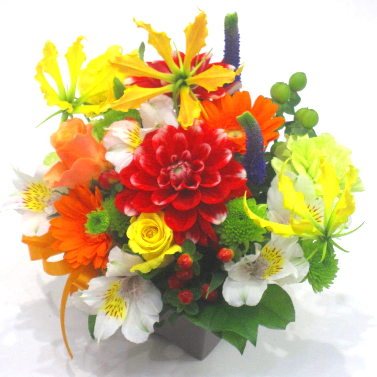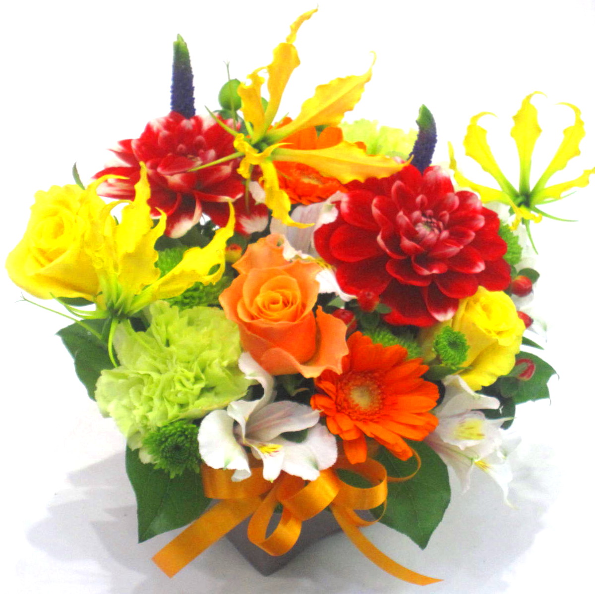 【商品制作担当・「誰かを応援したい」気持ちで制作しました。】お花でエネルギーをチャージできるような明るいアレンジメントです。ひとつひとつのお花が存在感があり、人に何かを感じさせる贈り物にピッタリですよ。また、ご利用されたお客様から「大変花持ちが良い」と好評をいただいております。静岡県長泉町から日本全国【真心】込めてお届けいたします。さまざまなご用途に贈る贈り物としてオススメです。大切な方へ贈るフラワーギフトやプレゼントなら「花樹園オンラインドットコム」に是非、お任せ下さいませ。