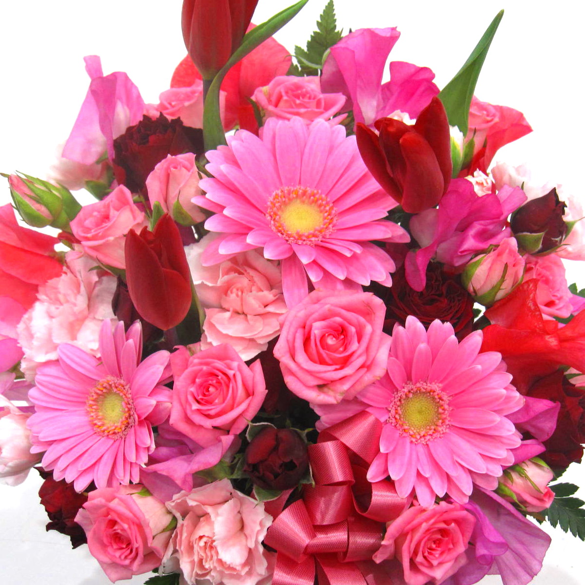 花材: メイン チューリップ、スイートピー、ミニバラ、ガーベラ、ミニカーネーションなど その他 葉物類など