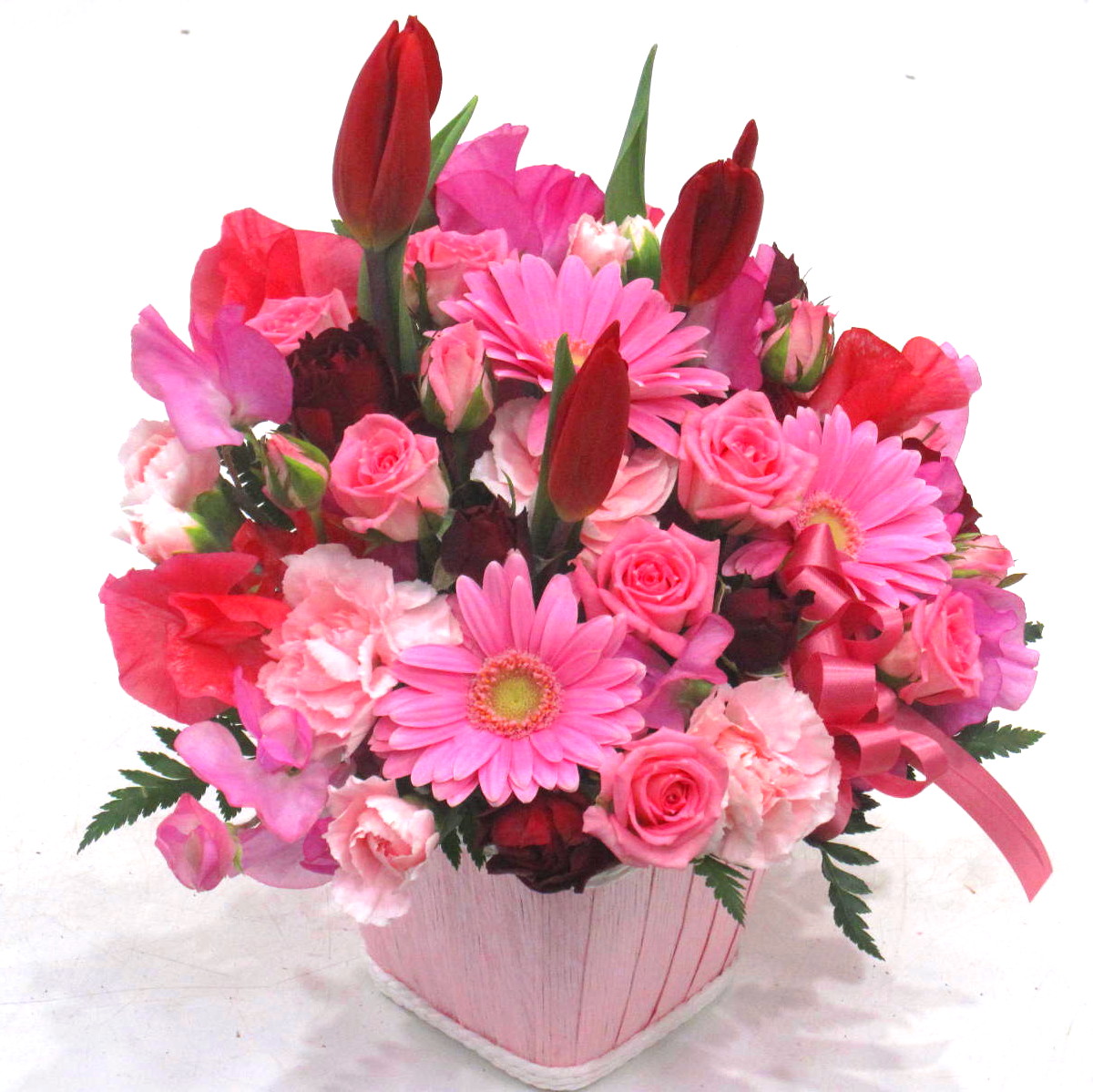春の贈り物にピッタリな「チューリップ」と「スイートピー」を入れたアレンジメント。ピンク&レッド系の春らしい落ち着いた色合いが上品で素敵ですよ。春の「お誕生日」「結婚祝い」「記念日」「歓送迎」「劇場・発表会」「御祝」「歓送迎」「入学・卒業・就職祝い」「愛のイベント」などにオススメです。【15時迄のご注文で翌日届きます】※こちらの商品についてのご相談、ご質問等ございましたら(メール)または(お電話)にて承ります。