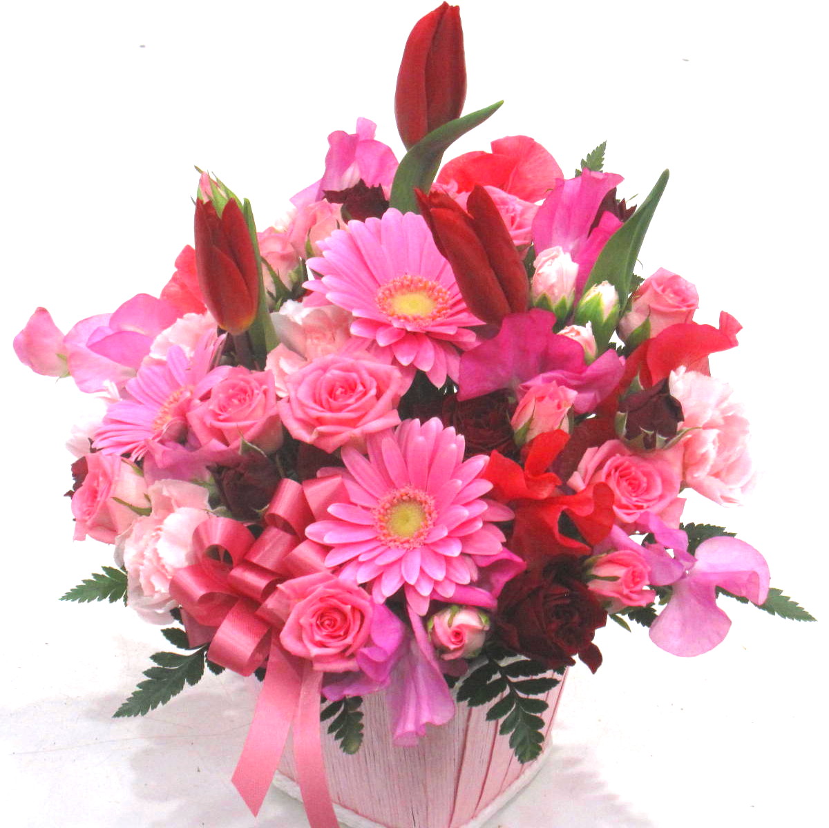 春らしい落ち着いたピンク&レッド系の上品でボリューム感のあるアレンジメントです。新潟県産の「チューリップ」と宮崎県産の「スイートピー」を使用、人気の高い「ミニバラ」や「ガーベラ」なども入れてシックで可愛らしい雰囲気が漂う素敵な仕上がりとなっております。春の甘い香りが、きっと心を癒してくれるでしょう。また、ご利用されたお客様から「大変花持ちが良い」と好評をいただいております。静岡県長泉町から日本全国【真心】込めてお届けいたします。春のさまざまなご用途に贈る贈り物としてオススメです。大切な方へ贈るフラワーギフトやプレゼントなら「花樹園オンラインドットコム」に是非、お任せ下さいませ。