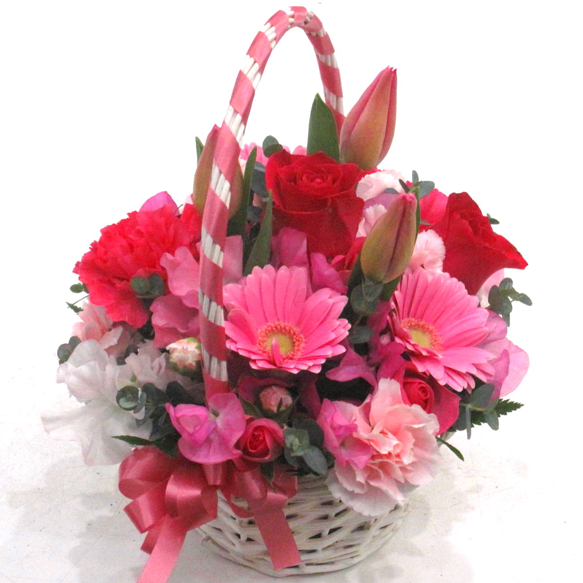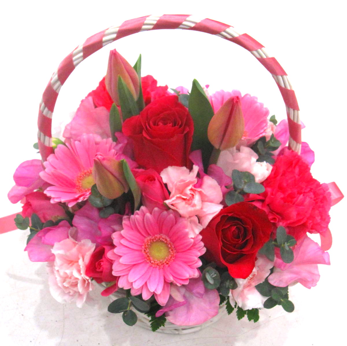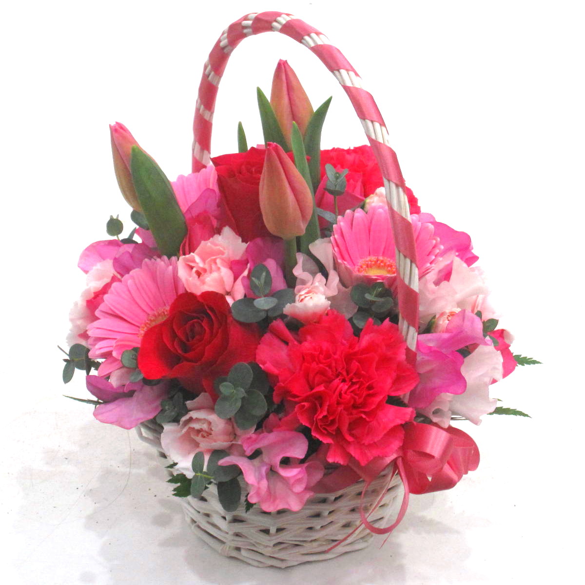 リボンでデザインした手付きバスケットがとっても可愛いアレンジメント。春の贈り物にピッタリな「チューリップ」と「スイートピー」を入れました。春の「お誕生日」「結婚祝い」「記念日」「歓送迎」「劇場・発表会」「御祝」「歓送迎」「入学・卒業・就職祝い」「愛のイベント」などにオススメです。【15時迄のご注文で翌日届きます】※こちらの商品についてのご相談、ご質問等ございましたら(メール)または(お電話)にて承ります。