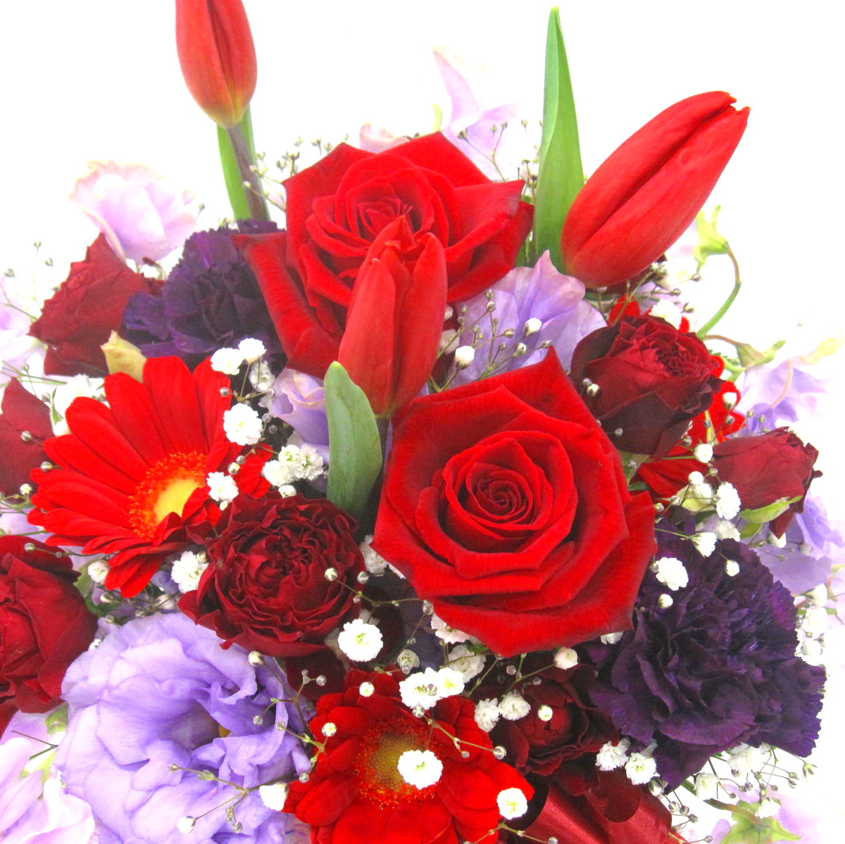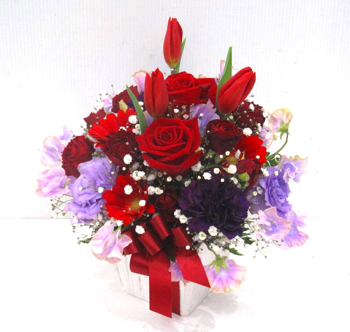 春らしいレッド&パープル系の上品でボリューム感のあるアレンジメントです。新潟県産の「チューリップ」と宮崎県産の「スイートピー」を使用、人気の高い「バラ」や「ガーベラ」なども入れてカッコよさが漂う、素敵な仕上がりとなっております。春の甘い香りが、きっと心を癒してくれるでしょう。また、ご利用されたお客様から「大変花持ちが良い」と好評をいただいております。静岡県長泉町から日本全国【真心】込めてお届けいたします。春のさまざまなご用途に贈る贈り物としてオススメです。大切な方へ贈るフラワーギフトやプレゼントなら「花樹園オンラインドットコム」に是非、お任せ下さいませ。