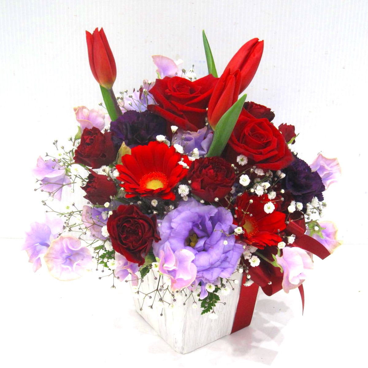 春の贈り物にピッタリな「チューリップ」と「スイートピー」を入れたアレンジメント。レッド&パープル系の春らしい落ち着いた色合いが上品で素敵ですよ。春の「お誕生日」「結婚祝い」「記念日」「歓送迎」「劇場・発表会」「御祝」「歓送迎」「入学・卒業・就職祝い」「愛のイベント」などにオススメです。【15時迄のご注文で翌日届きます】※こちらの商品についてのご相談、ご質問等ございましたら(メール)または(お電話)にて承ります。