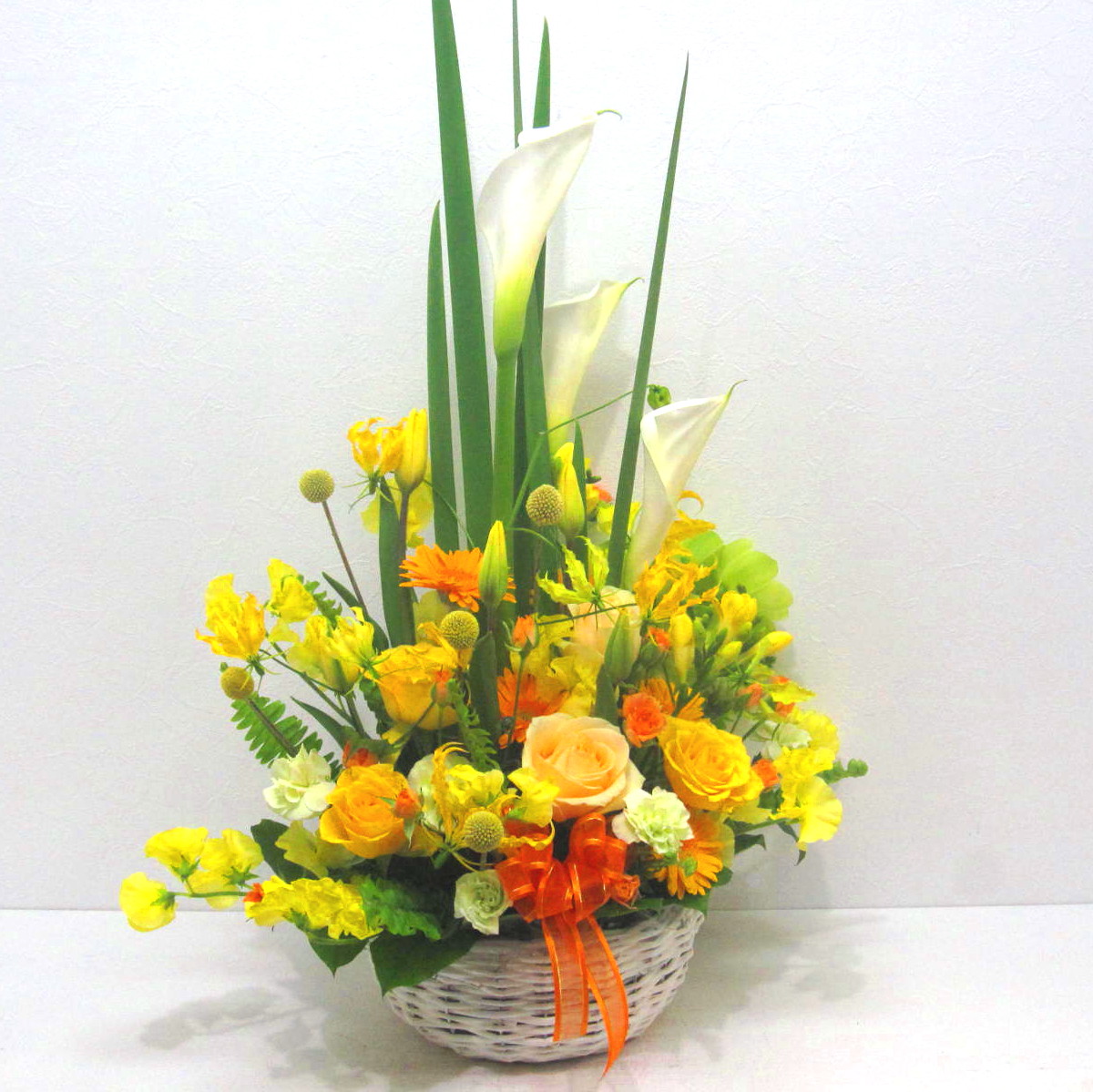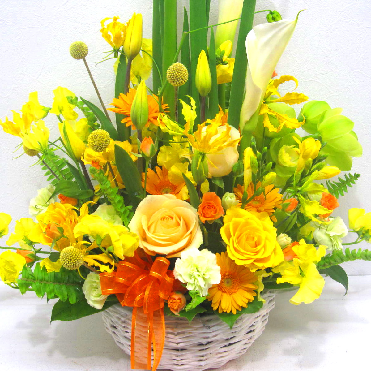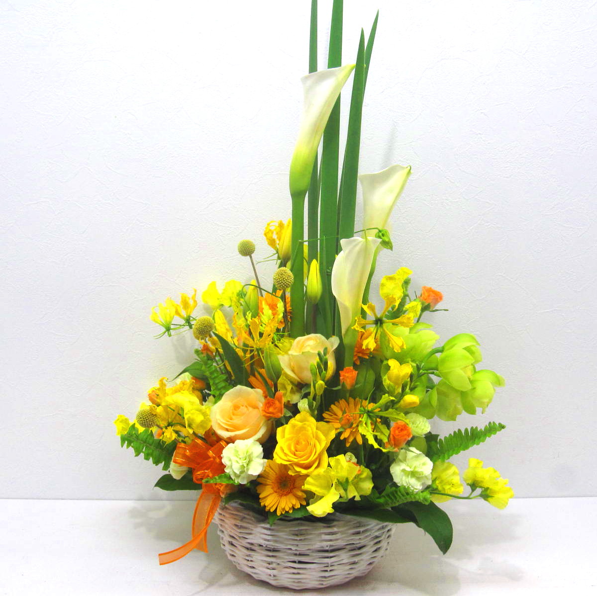 資材・ラッピング: 丸型ホワイトバスケット、リボン、吸水性スポンジ、コミュニケーションカード(取扱説明書)