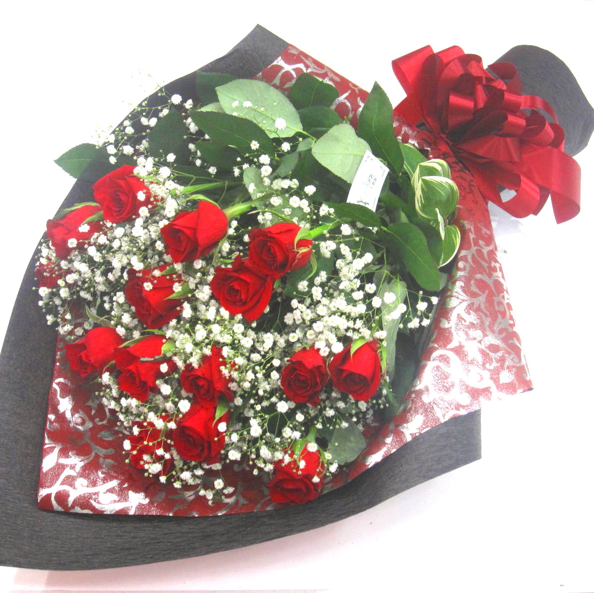【男性必見!!】ご主人から奥様に・彼女へのプレゼントに・愛の告白に。男性には「ここぞ」という時が必ずあります。そんな時にはこの花束がオススメです。赤いバラをふんだんに入れてカスミソウでボリューム感を演出した華やかな花束。ラッピングもこだわりカックイィ感じにお包みします。誰もが1度は贈ってみたい赤いバラ、誰もが1度は貰ってみたい赤いバラ。【15時迄のご注文で翌日届きます】【ご希望の本数指定でもお作りします】※こちらの商品についてのご相談、ご質問等ございましたら(メール)または(お電話)にて承ります。