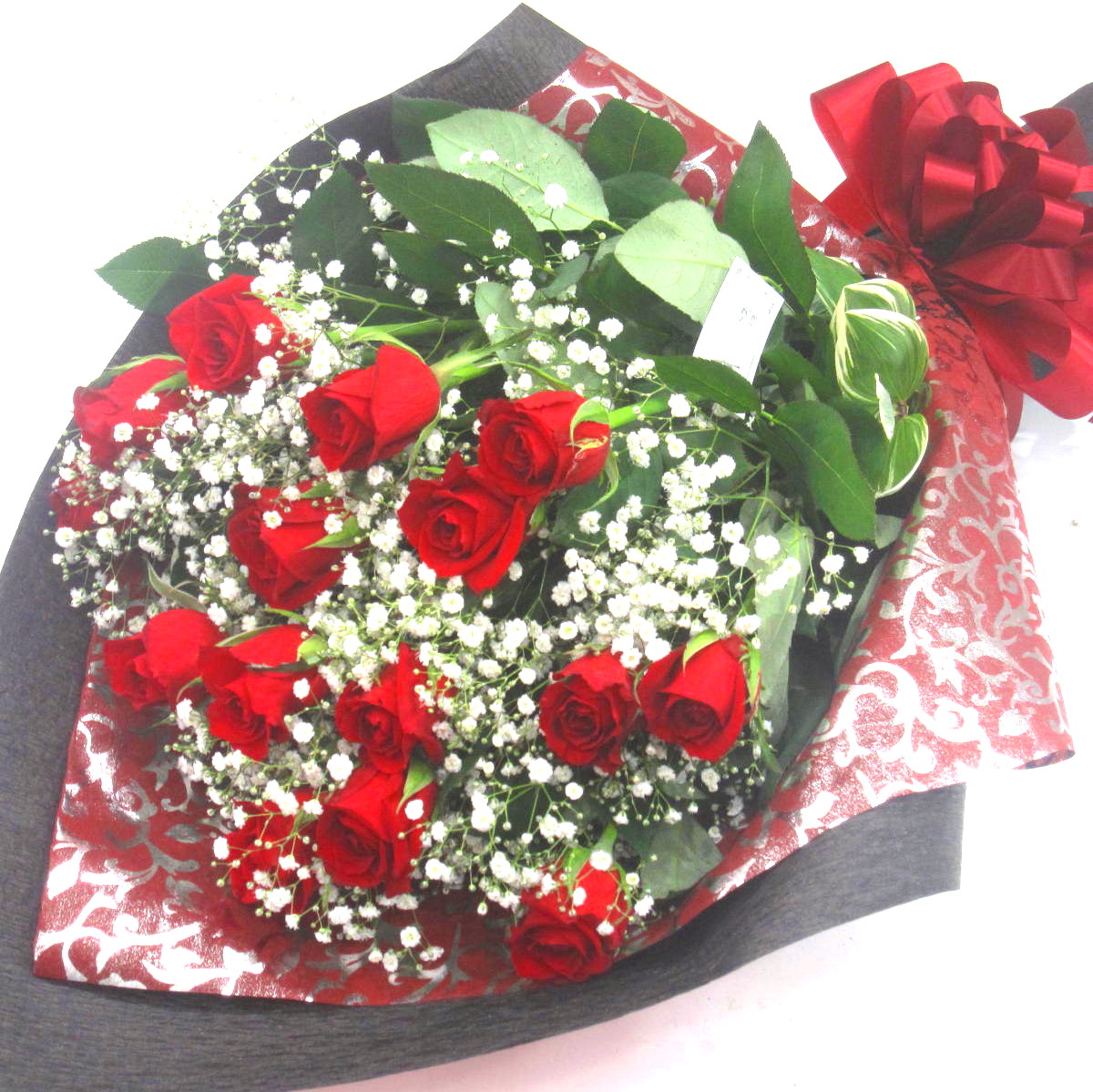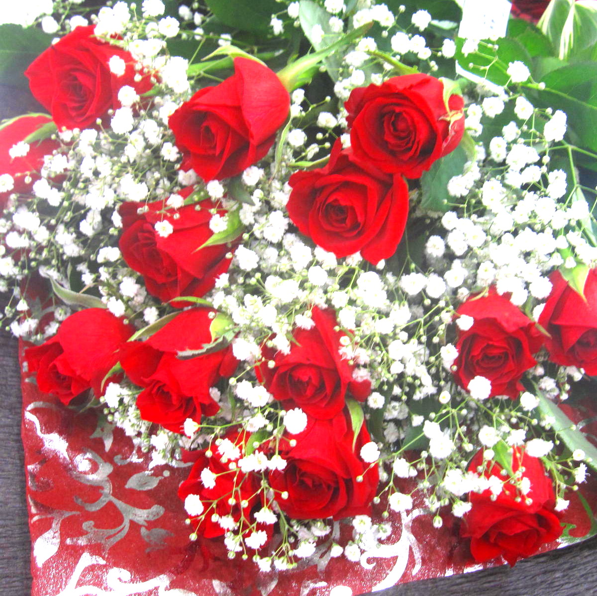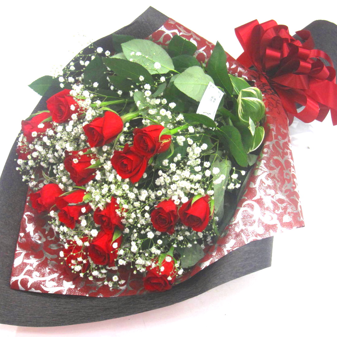 花材: メイン 赤いバラ(国産)、かすみ草(国産) その他 葉物類