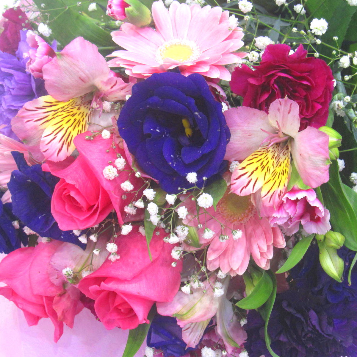 花材: メイン バラ、ガーベラ、トルコギキョウ、ミニカーネーションなど その他 かすみ草、葉物類など