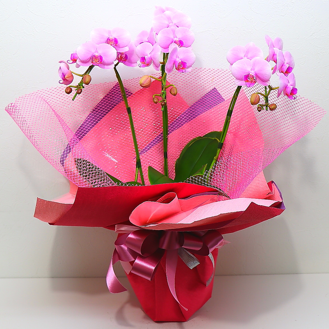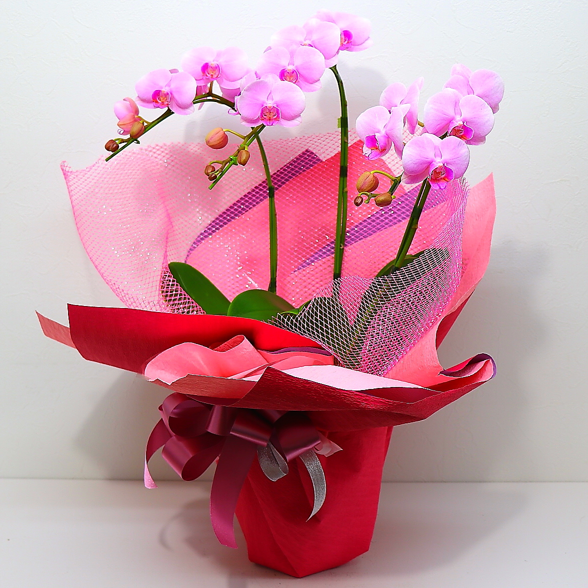 その日の朝、東京の市場から厳選した、高品質な胡蝶蘭です。大きさも高さ65cm×幅40cm×奥行30cmでラッピングして綺麗で見栄えがあります。可愛らしいピンク花弁の明るい上品な雰囲気が大切な日を華やかに演出してくれますよ。また、ご購入されたお客様から「大変花持ちが良い」と高い評価を頂いております。静岡県長泉町から日本全国【真心】込めてお届けいたします。さまざまなお祝い用途に贈る贈り物としてオススメです。大切な方へ贈るフラワーギフトやプレゼントなら「花樹園オンラインドットコム」に是非、お任せ下さいませ。