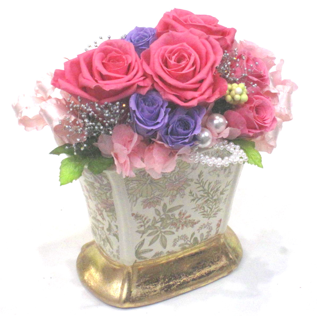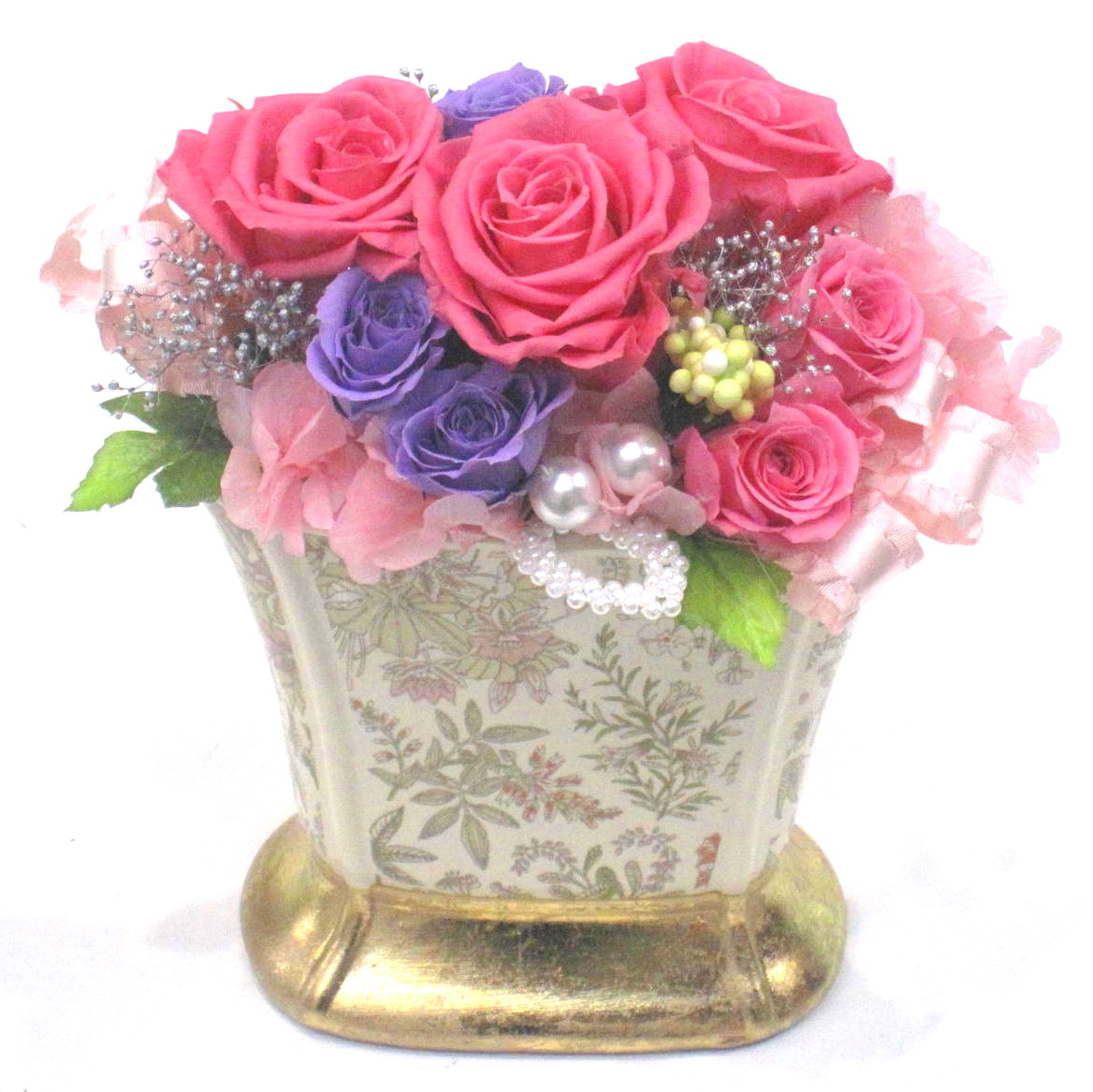 ヨーロピアンスタイル花器にアレンジした上品なプリザーブドフラワー。女性に差し上げるプレゼントにオススメですよ。※こちらの商品についてのご相談、ご質問等ございましたら(メール)または(お電話)にて承ります。