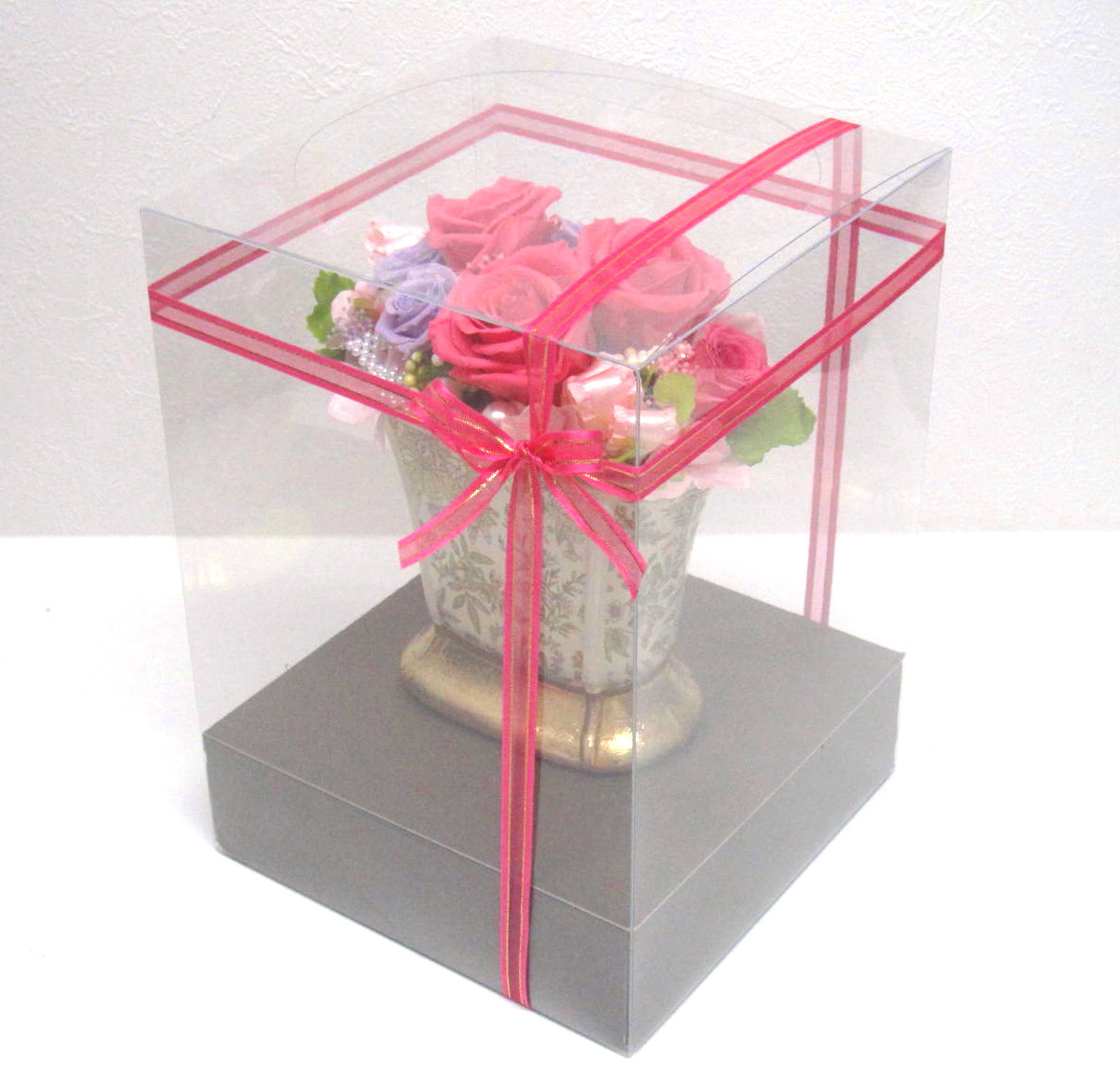 資材・ラッピング: ヨーロピアンスタイル花器、モニメントピック類、リボン、ドライフォーム、ギフト用クリアケース付き、フラワーケアカード(取扱説明書)