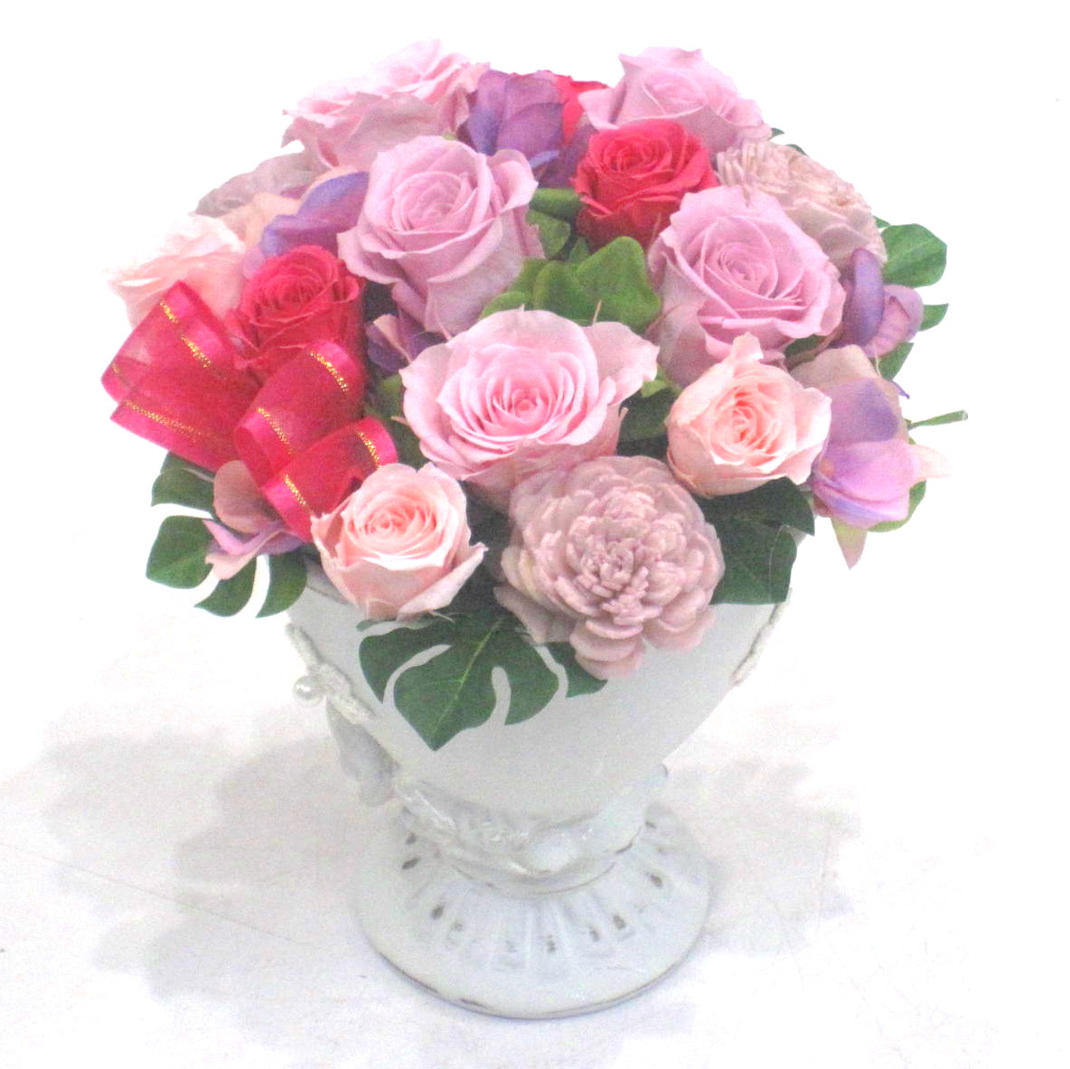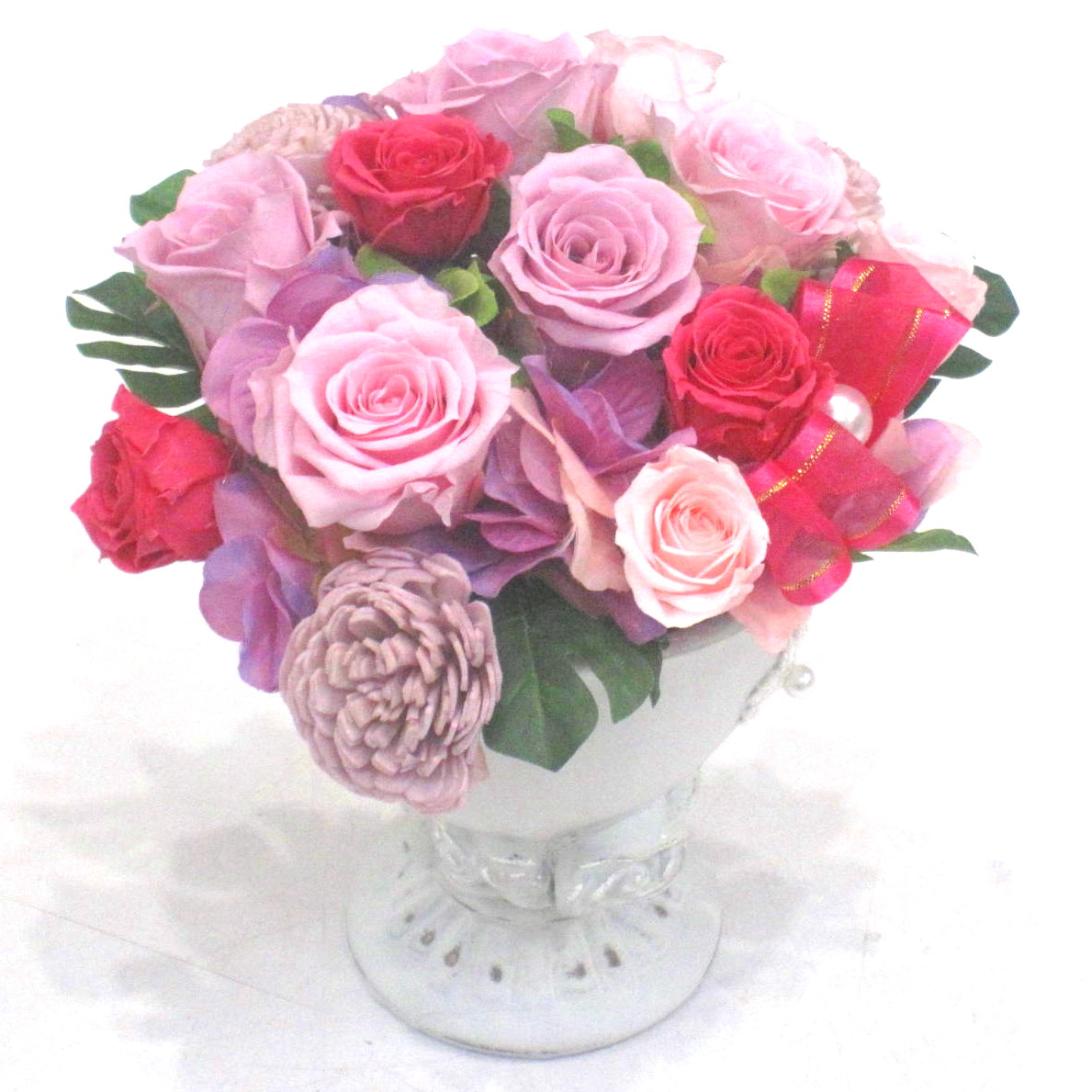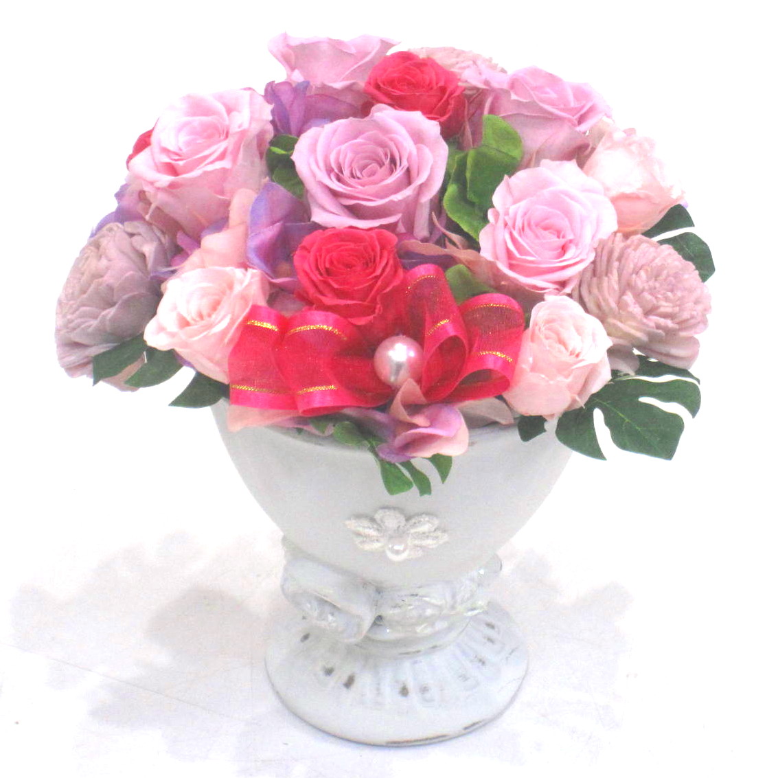 とっても上品なピンク&パープル系のプリザーブドフラワーです。花器もホワイトでヨロピアン風の素敵な器ですよ。可愛らしくもあり華やかな雰囲気できっと喜ばれること間違いなしですよ。当店ではお客様の想い大切に【こころを込めて】お作りいたします。静岡県駿東郡長泉町から日本全国へお届けします。是非、想いを込めたフラワーギフトにいかがですか!?