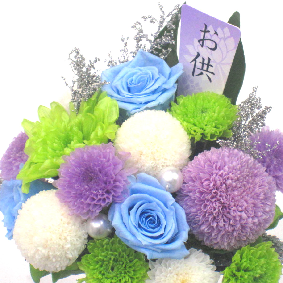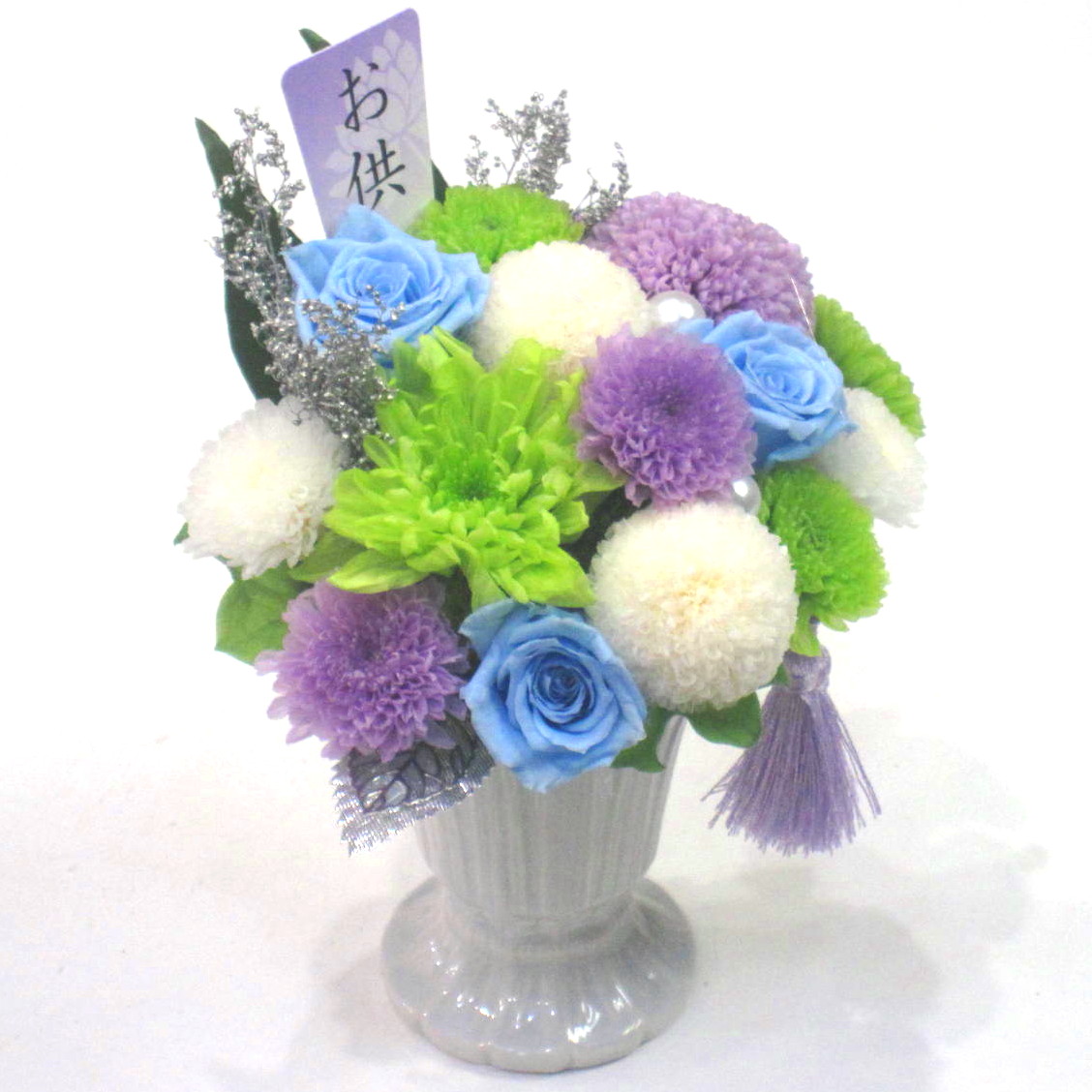 故人を偲ぶ上品なプリザーブドフラワーです。白系主体に淡いブルーやグリーン色を入れたボリューム感のある雰囲気控えめな色合いです。仏壇などに飾るのに最適なサイズです。※こちらの商品についてのご相談、ご質問等ございましたら(メール)または(お電話)にて承ります