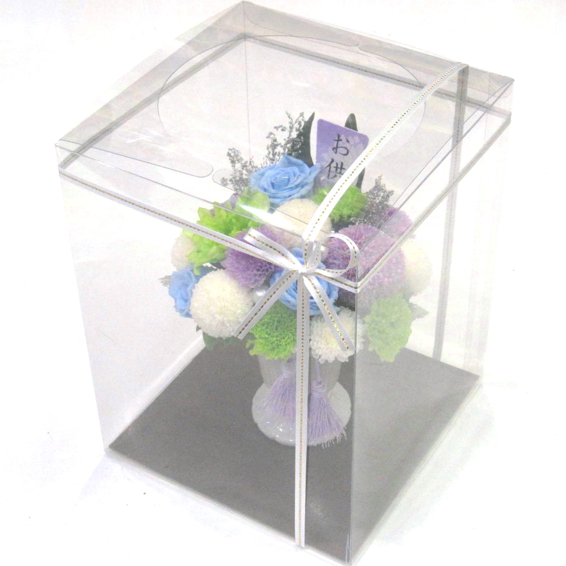 資材・ラッピング: ヨーロピアン花器(ホワイト)、モニメントピック類、リボン、ドライフォーム、ギフト用クリアケース付き、コミュニケーションカード(取扱説明書)