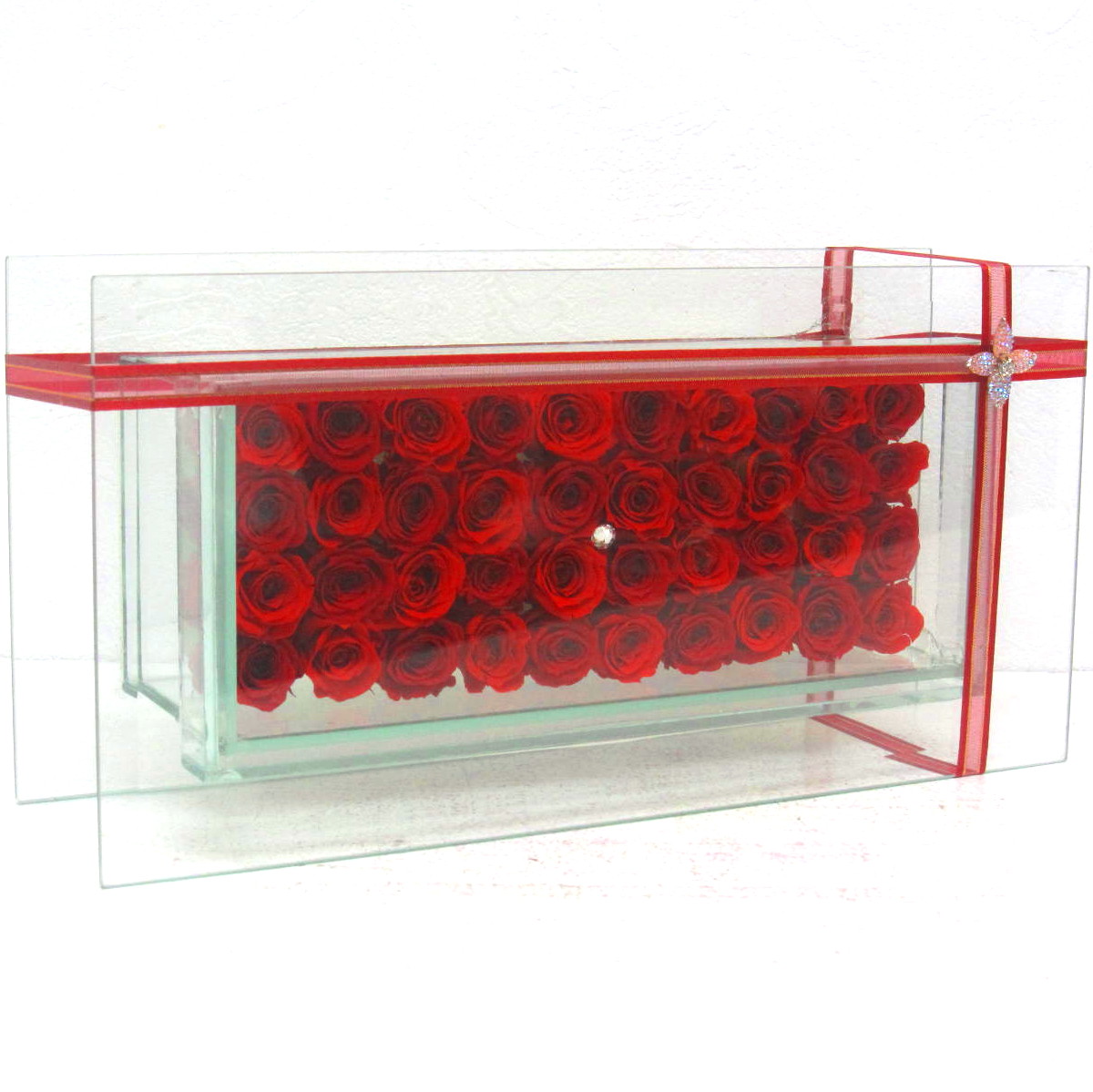 高級感の漂う、透明なガラスフレームにプリザーブドローズを48輪デザイン的にアレンジした特別なプリザーブドフラワー。スワロフスキーがガラスフレームと赤系のプリザーブドローズを引き立てます。【15時迄のご注文で翌日届きます】※こちらの商品についてのご相談、ご質問等ございましたら(メール)または(お電話)にて承ります。