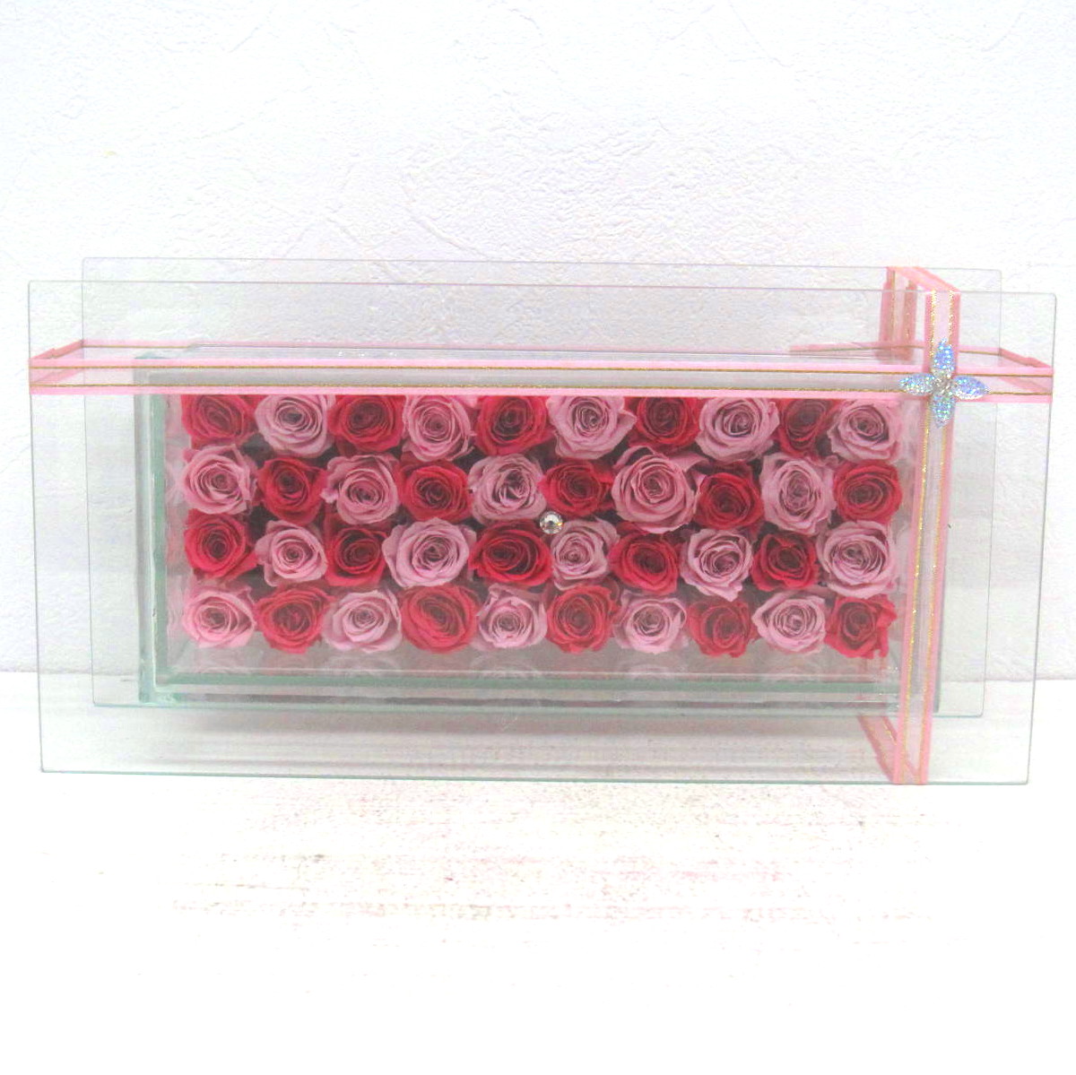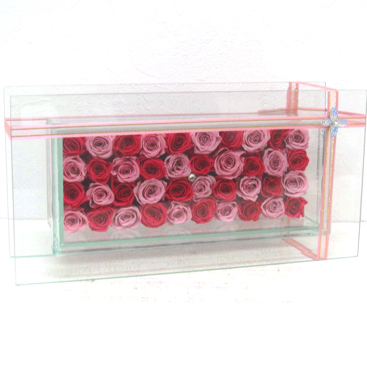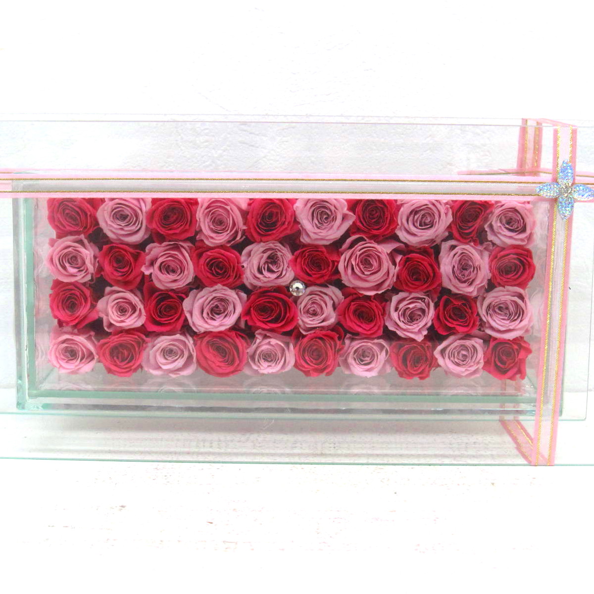 高級感の漂う、透明なガラスフレームにプリザーブドローズを48輪デザイン的にアレンジした特別なプリザーブドフラワー。スワロフスキーがガラスフレームとピンク系のプリザーブドローズを引き立てます。【15時迄のご注文で翌日届きます】※こちらの商品についてのご相談、ご質問等ございましたら(メール)または(お電話)にて承ります。