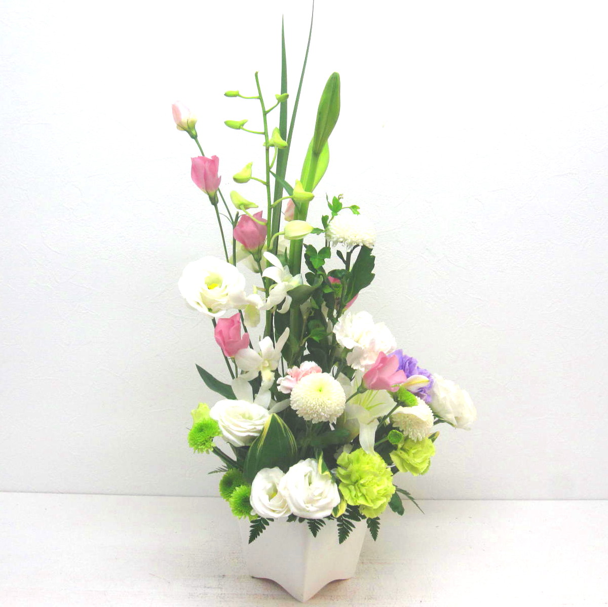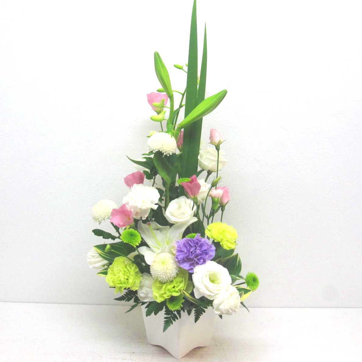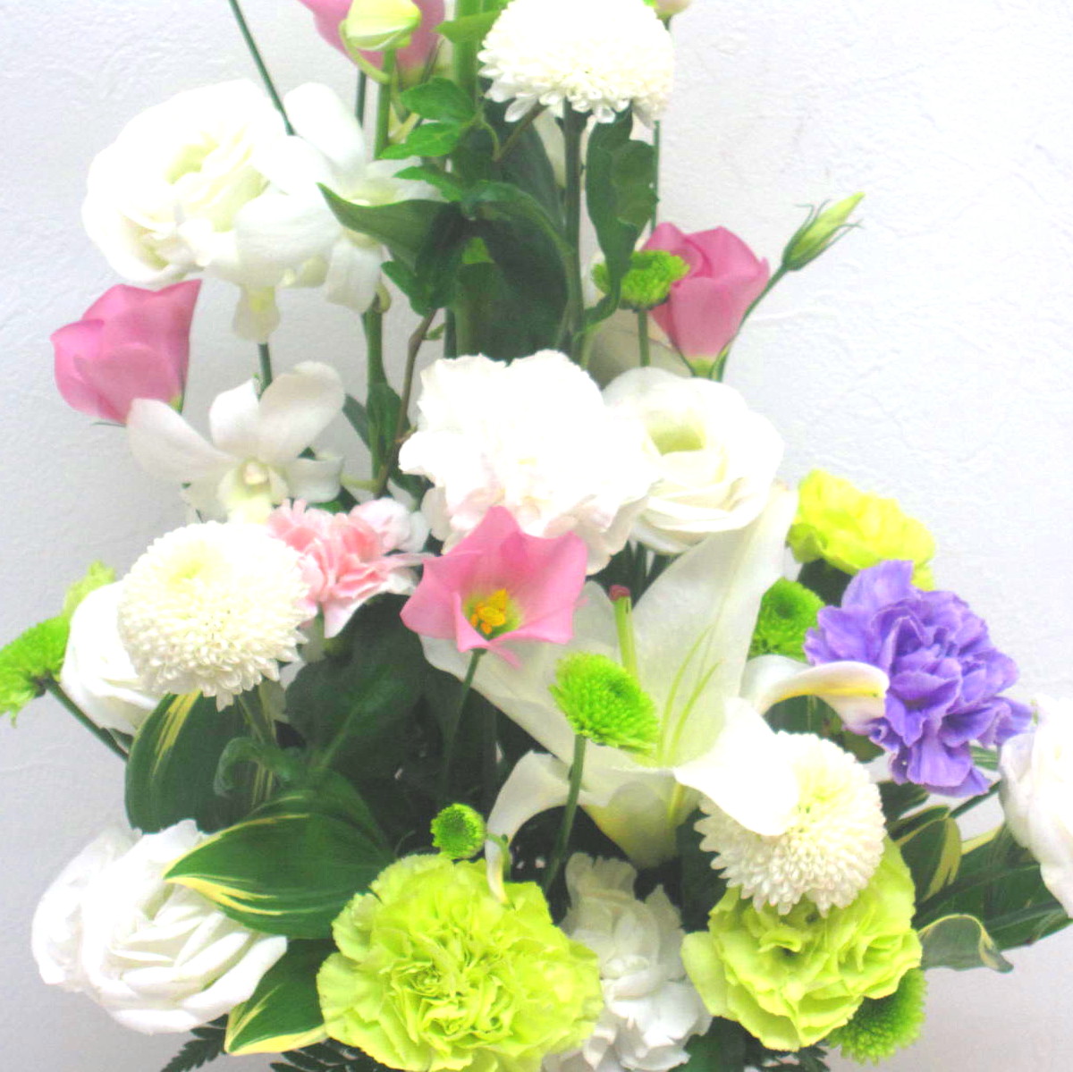 白系主体で淡い色の入った上品なアレンジメントです。スタイリッシュでデザイン的な雰囲気のL型アレンジ。また、花持ちも良い花材を中心に使い上品にまとめます。目を閉じて心の中にいる故人への想いをそっと呼び起こします。当店では、お客様のその想いをしっかりと受け止め、心を込めて制作致します。静岡県から全国へお届けします。故人を偲ぶ色々なシーンで是非、ご利用下さい。