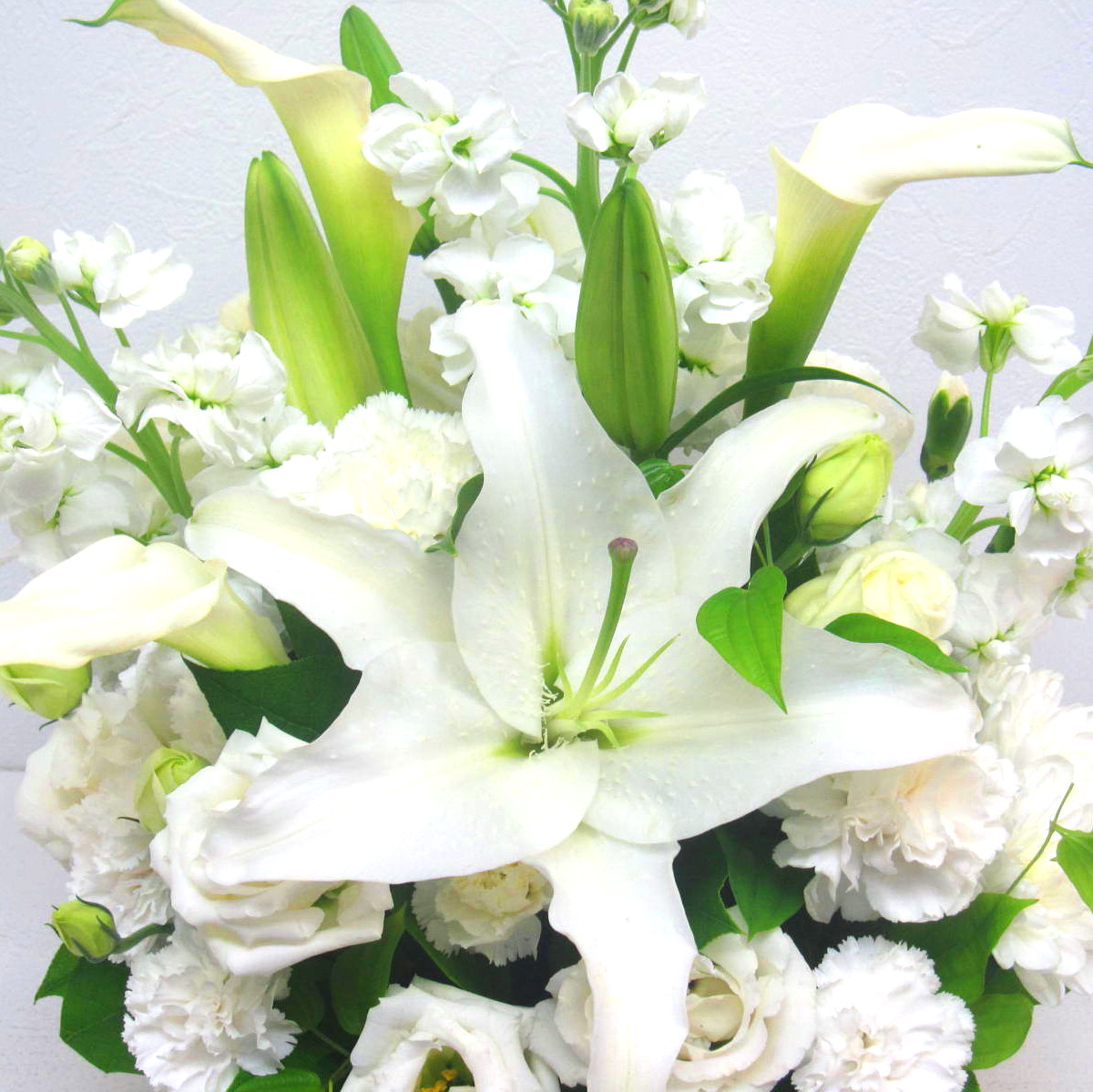 存在感のある「ユリ」と春のお花「ストック」を中心に白系主体で上品に制作致します。また、その日、市場から入荷した鮮度の良いお花でお作りしますので花持ちが良く、ご利用いただいたお客様から「大変花持ちが良い」と高い評価をいただいております。目を閉じて心の中にいる故人への想いをそっと呼び起こします。当店では、お客様のその想いをしっかりと受け止め、心を込めて制作致します。静岡県から全国へお届けします。春の故人を偲ぶ色々なシーンで是非、ご利用下さい。