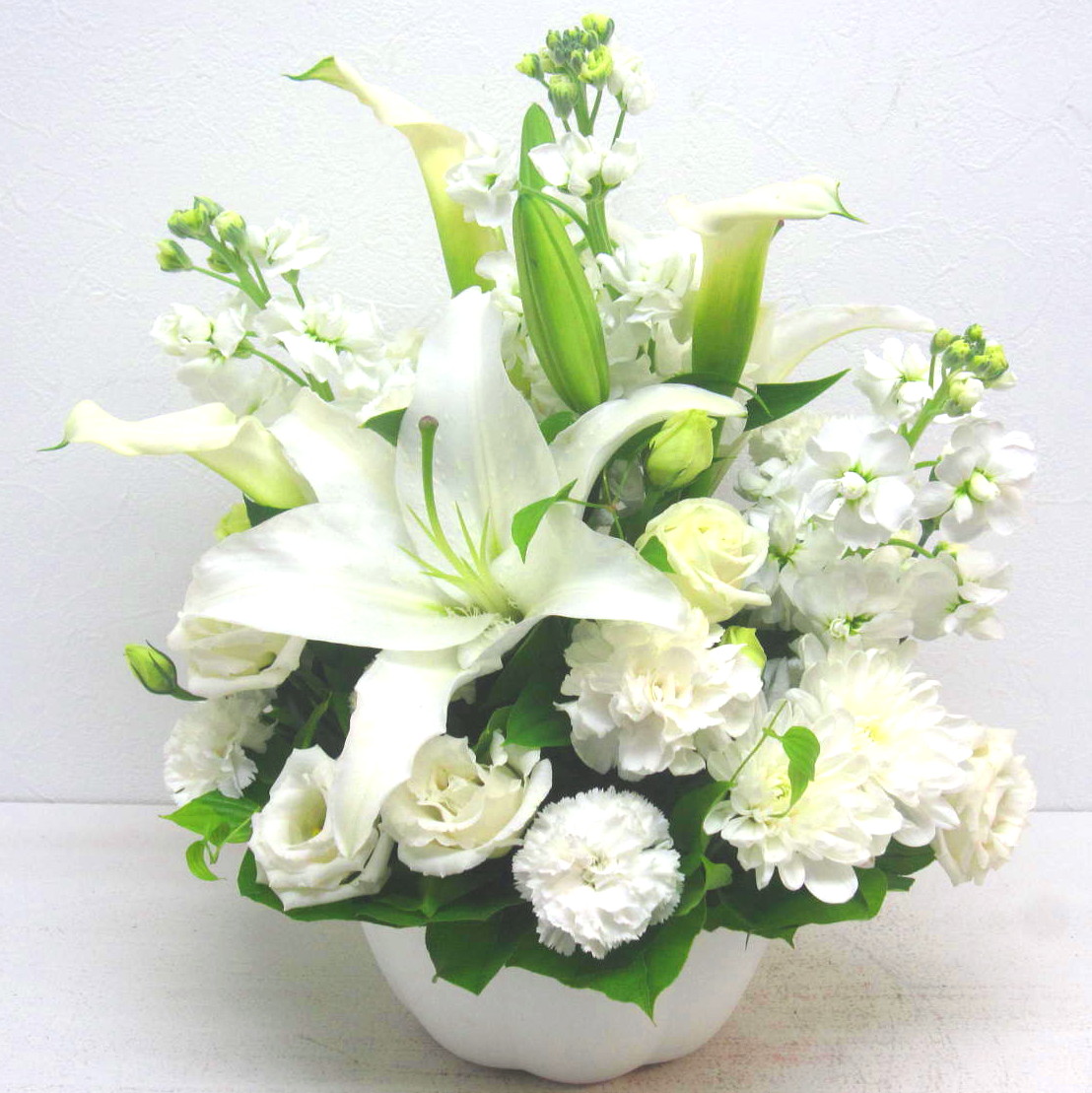 花材: メイン ユリ、カラー、ストック、カーネーション、トルコギキョウなど その他 葉物類など