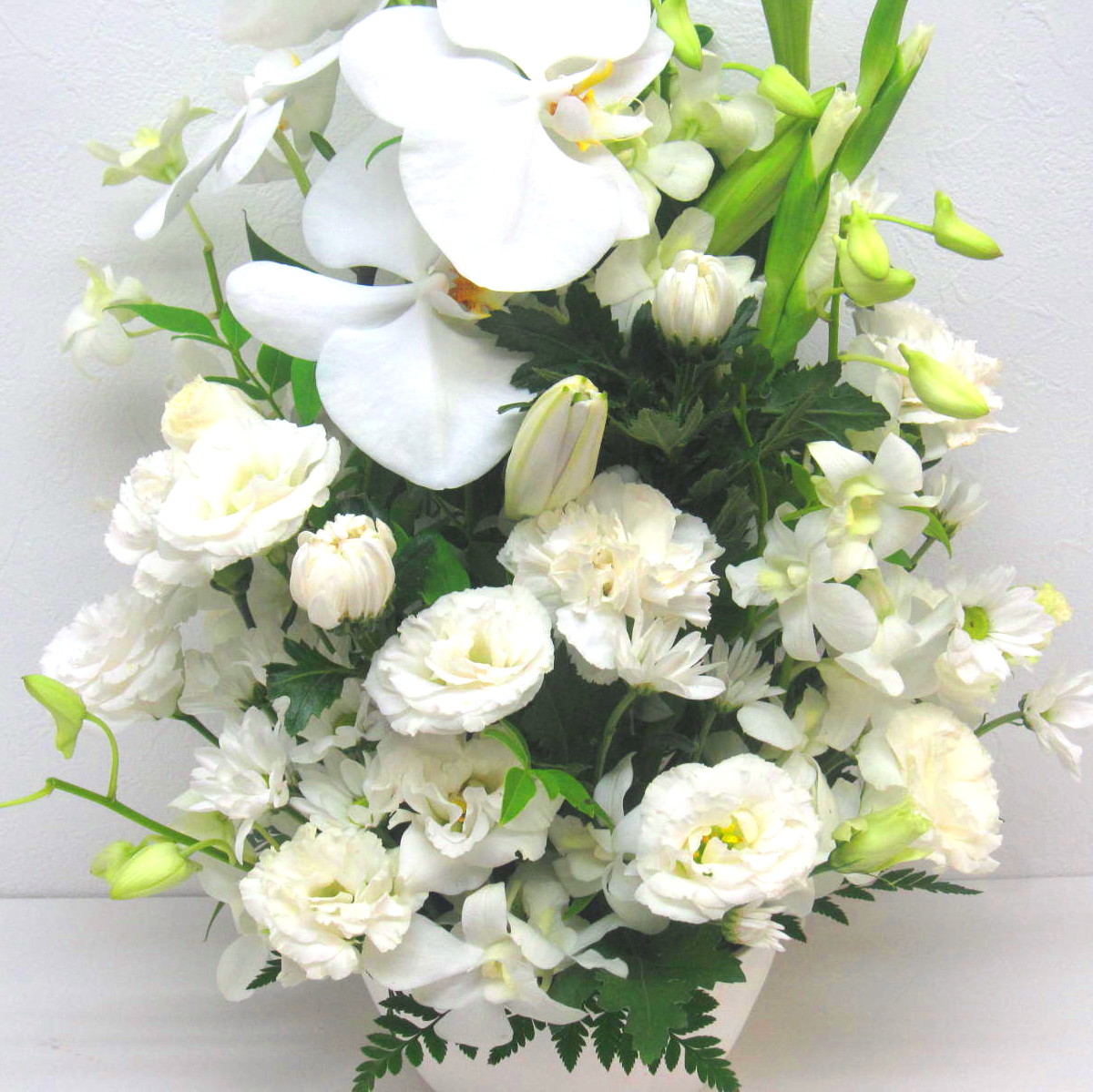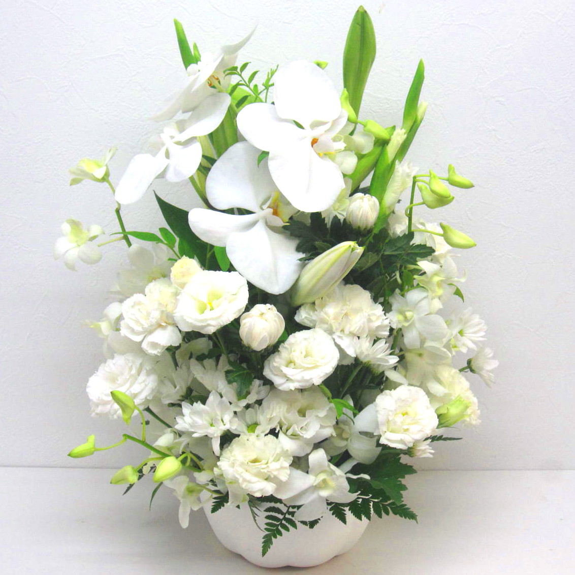 高級なお花「コチョウラン」を入れて洋花と和花を中心の白系アレンジメント。純白の清楚な色合いが優しく故人を偲びます。仏壇の両サイドにセットで飾っても良いですし、1つで飾っても上品で素敵です。【15時迄のご注文で翌日届きます】※こちらの商品についてのご相談、ご質問等ございましたら(メール)または(お電話)にて承ります。
