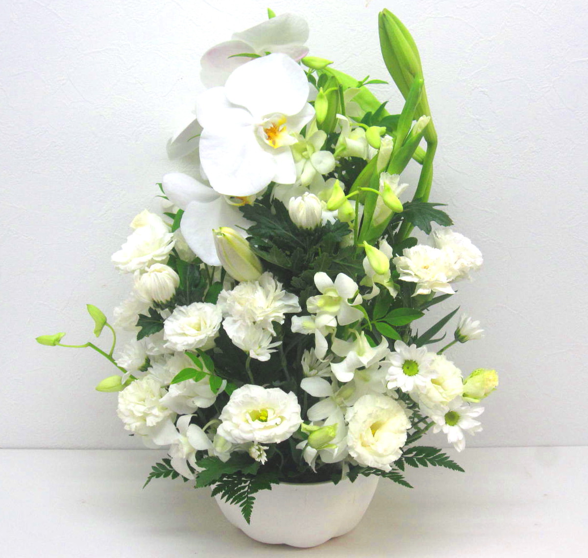 花材: メイン ユリ、キク、コチョウラン、カーネーション、トルコギキョウ、デンファレなど その他 葉物類など