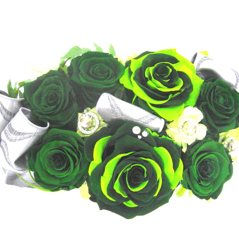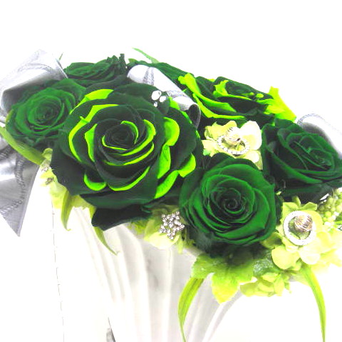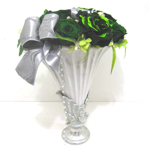 貴賓溢れる最高級のプリザーブドフラワーをお洒落な花器にアレンジしました。深いグリーンの落ち着いた色合いでグリーンの濃淡のバラの花弁を1枚1枚丁寧に貼り付けメリア状に仕立て巨大輪に、下には光り輝くクリスタルガーランドを垂れ下げより一層の高級感溢れるアレンジにしました。どこから見ても綺麗に見えます。お誕生日、開店・開業祝い、展示会などさまざまな贈り物にオススメです。当店ではお客様の想いを大切に【こころを込めて】お作りいたします。静岡県長泉町から手渡しお届けまたは宅急便で全国にお届けします。是非、さまざまな贈り物に。