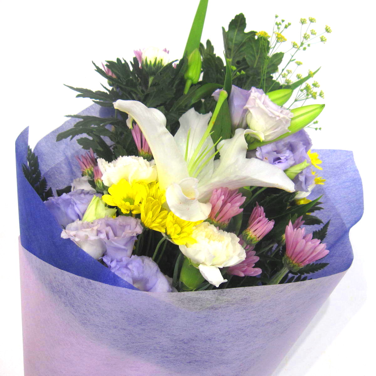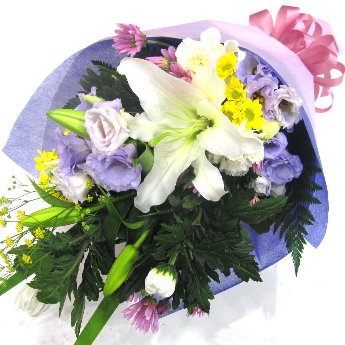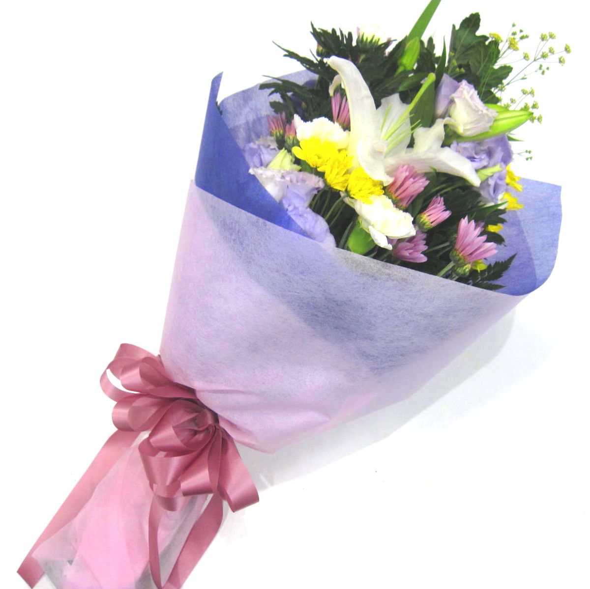 ユリやキクなど持ちの良いお花を入れた少し明るい控えめな花束です。故人をそっと思い出し静かに偲びます。【15時迄のご注文で翌日届きます】※こちらの商品についてのご相談、ご質問等ございましたら(メール)または(お電話)にて承ります。