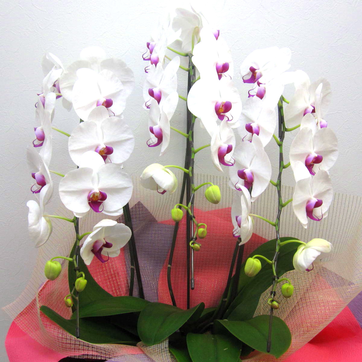 その日の朝、東京の市場から厳選した、高品質な胡蝶蘭です。大きさも高さ90cm×幅50cm×奥行50cmで見栄えもあります。白い花弁に赤のリップが入った上品な雰囲気が大切な日を華やかに演出してくれますよ。また、ご購入されたお客様から「大変花持ちが良い」と高い評価を頂いております。静岡県長泉町から日本全国【真心】込めてお届けいたします。さまざまなお祝い用途に贈る贈り物としてオススメです。大切な方へ贈るフラワーギフトやプレゼントなら「花樹園オンラインドットコム」に是非、お任せ下さいませ。
