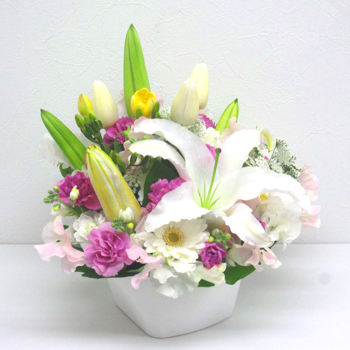 花材: メイン ユリ、ガーベラ、カーネーション、チューリップ、スイートピーなど その他 葉物類など