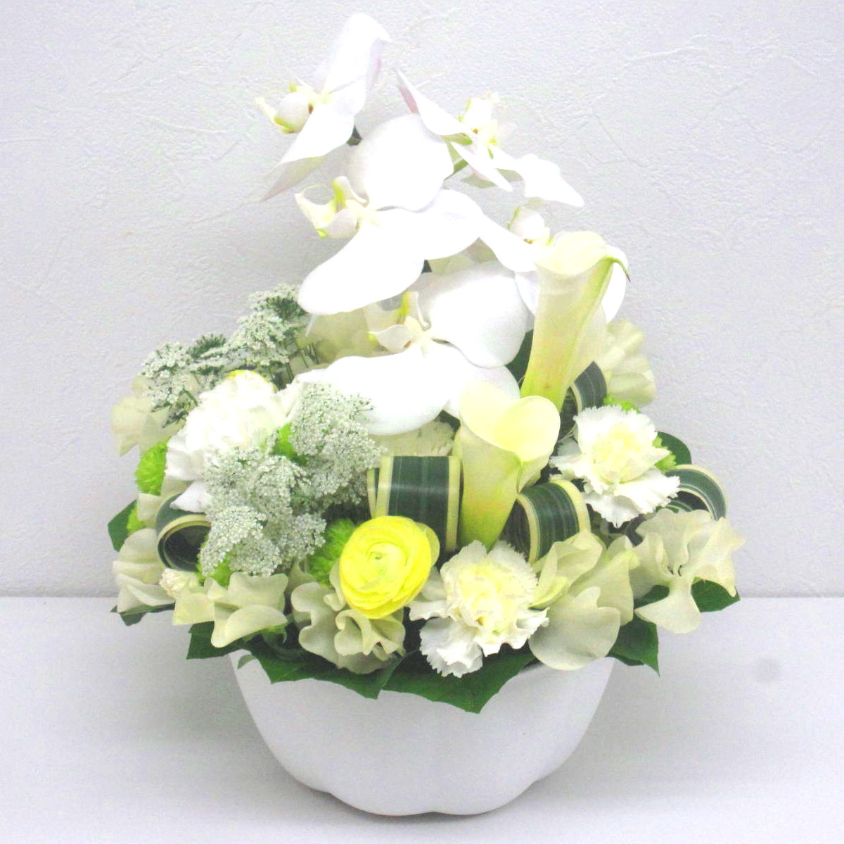 花材: メイン コチョウラン、カーネーション、ラナンキュラス、スイートピーなど その他 葉物類など