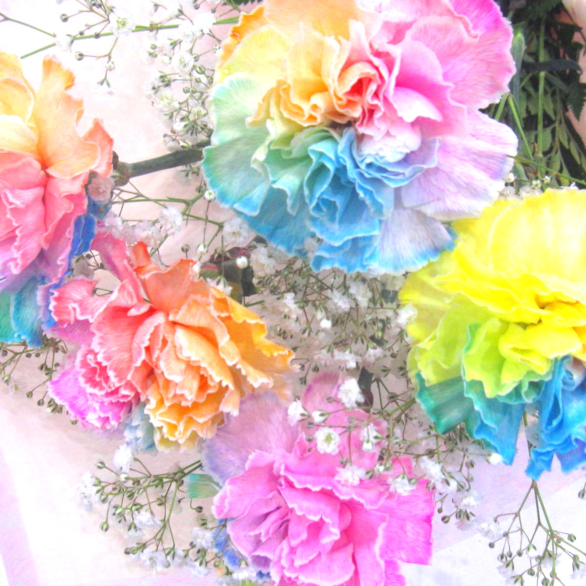花材: メイン パステルレインボーカーネーション その他 かすみ草、葉物類など