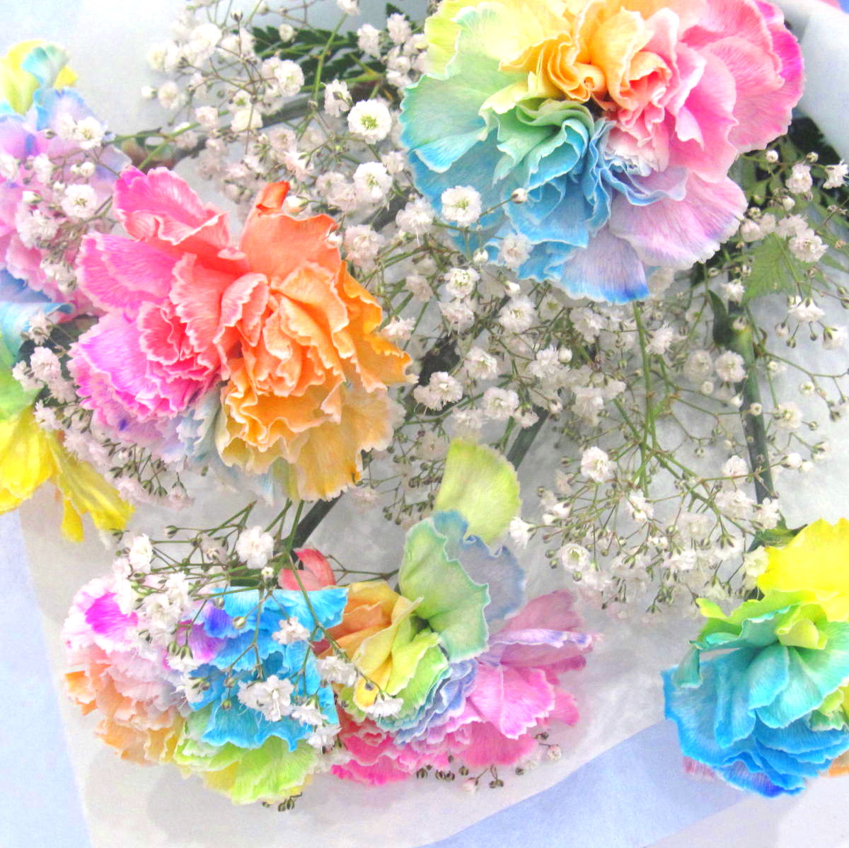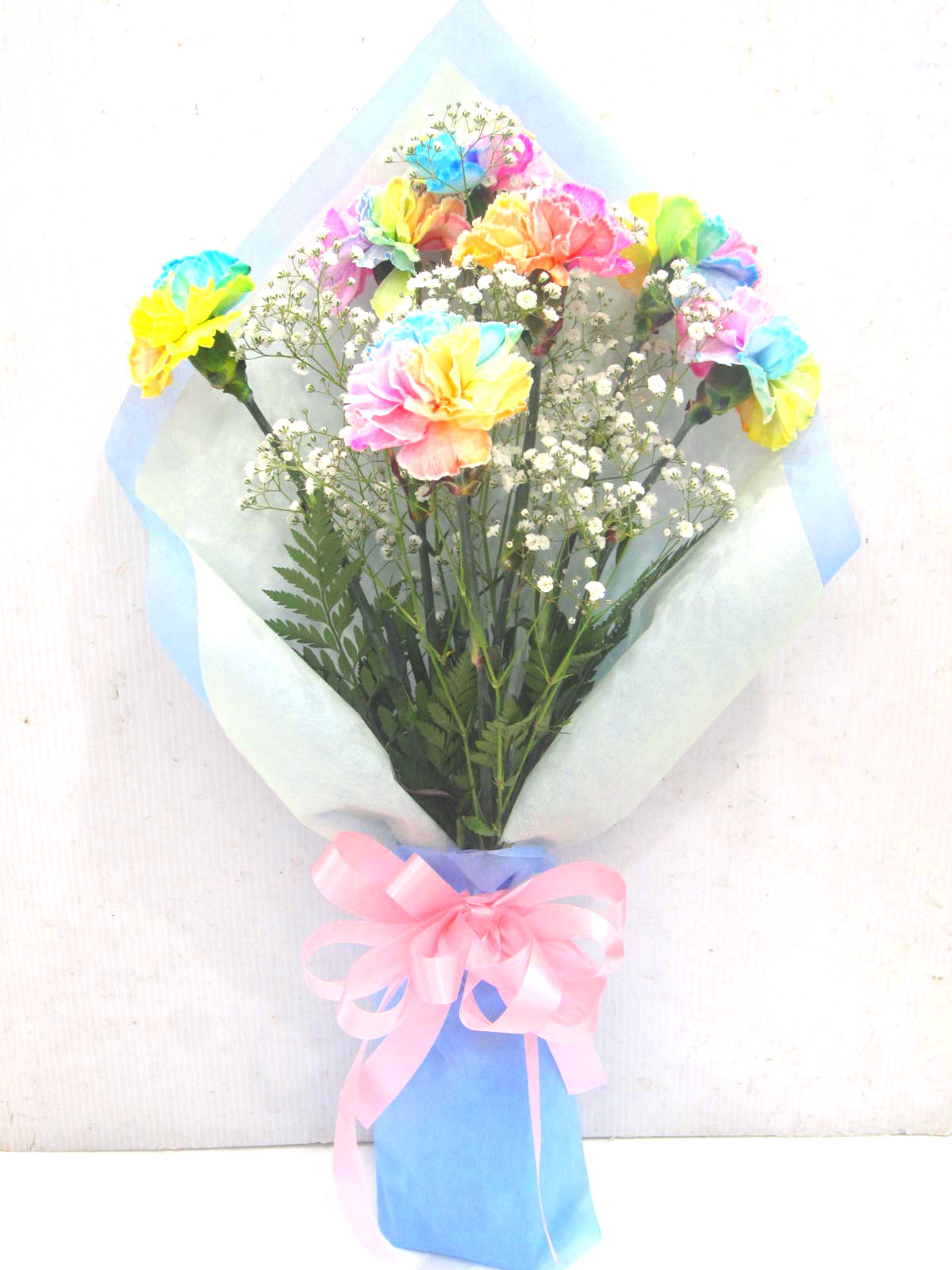 花材: メイン パステルレインボーカーネーション その他 かすみ草、葉物類など