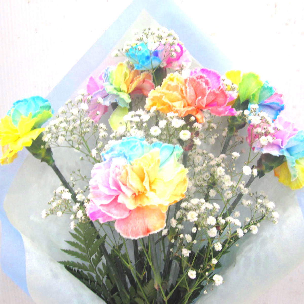 《今年の母の日は2026年5月10日(日)》絶対驚く!!7色の優しい色合いのレインボーカーネーションを7本入れてかすみ草を入れた希少で優しい雰囲気の花束。【15時迄のご注文で翌日届きます】※こちらの商品についてのご相談、ご質問等ございましたら(メール)または(お電話)にて承ります。